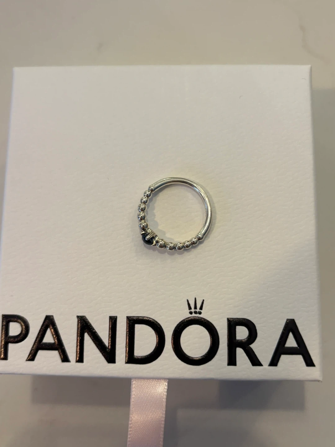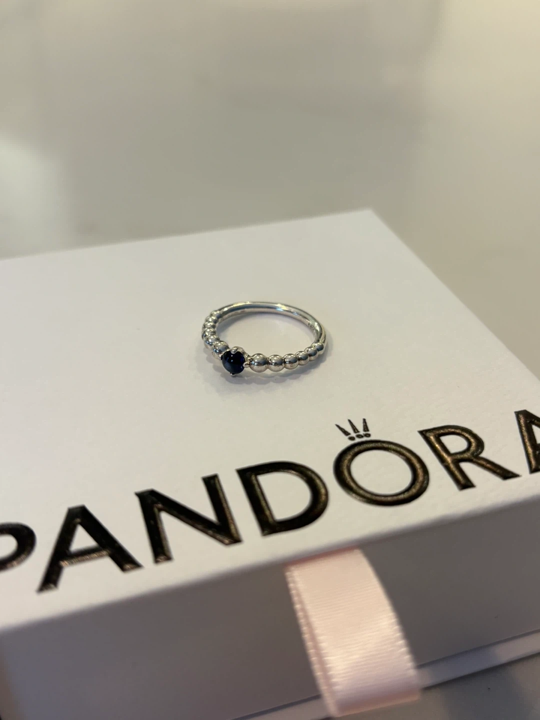 This is a silver Pandora ring, a stylish piece featuring a unique beaded design and a striking dark blue stone.