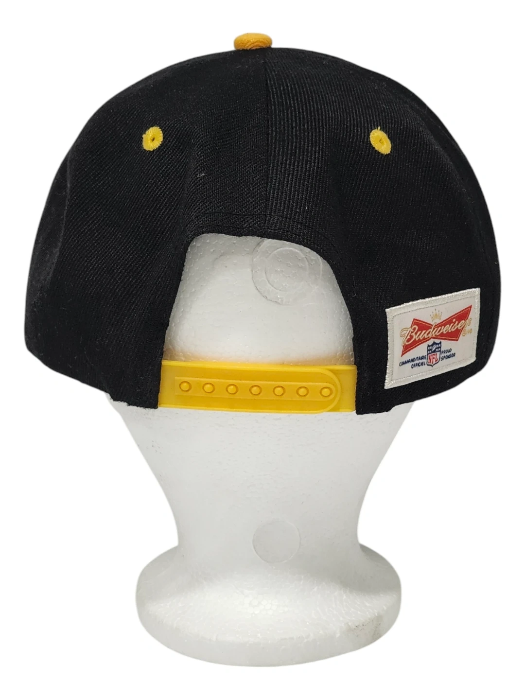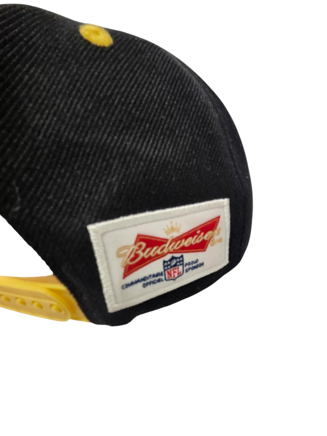 Show your team spirit with this black Pittsburgh Steelers snapback hat. It features the team name embroidered in yellow on the front and a Budweiser NFL sponsor tag on the side. This hat has an adjustable yellow snapback closure for a comfortable fit.