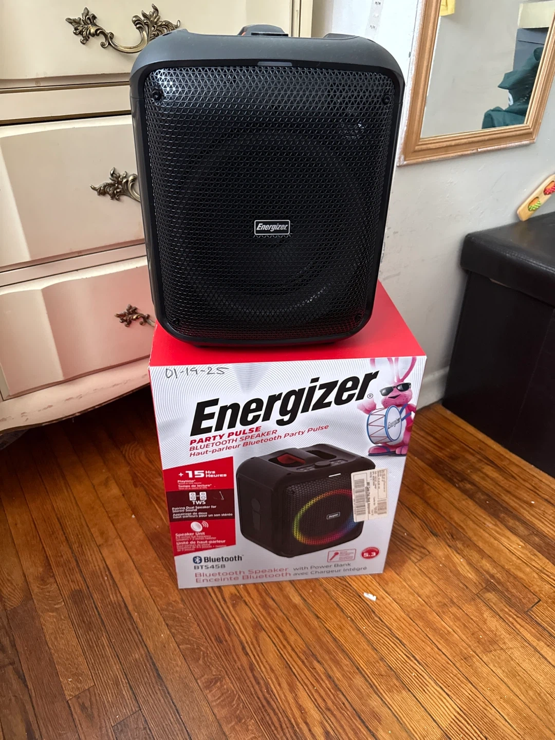 10Selling an Energizer BTS458 Bluetooth speaker! It's a Party Pulse Bluetooth speaker with a power bank. The box indicates it has +15 hrs playtime and TWS pairing for stereo sound. Comes with the original box!