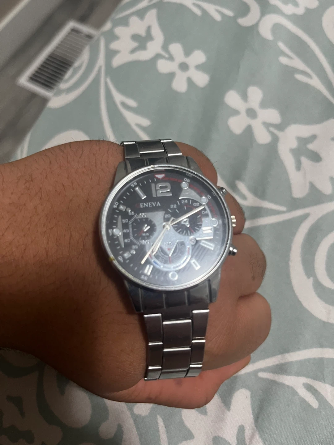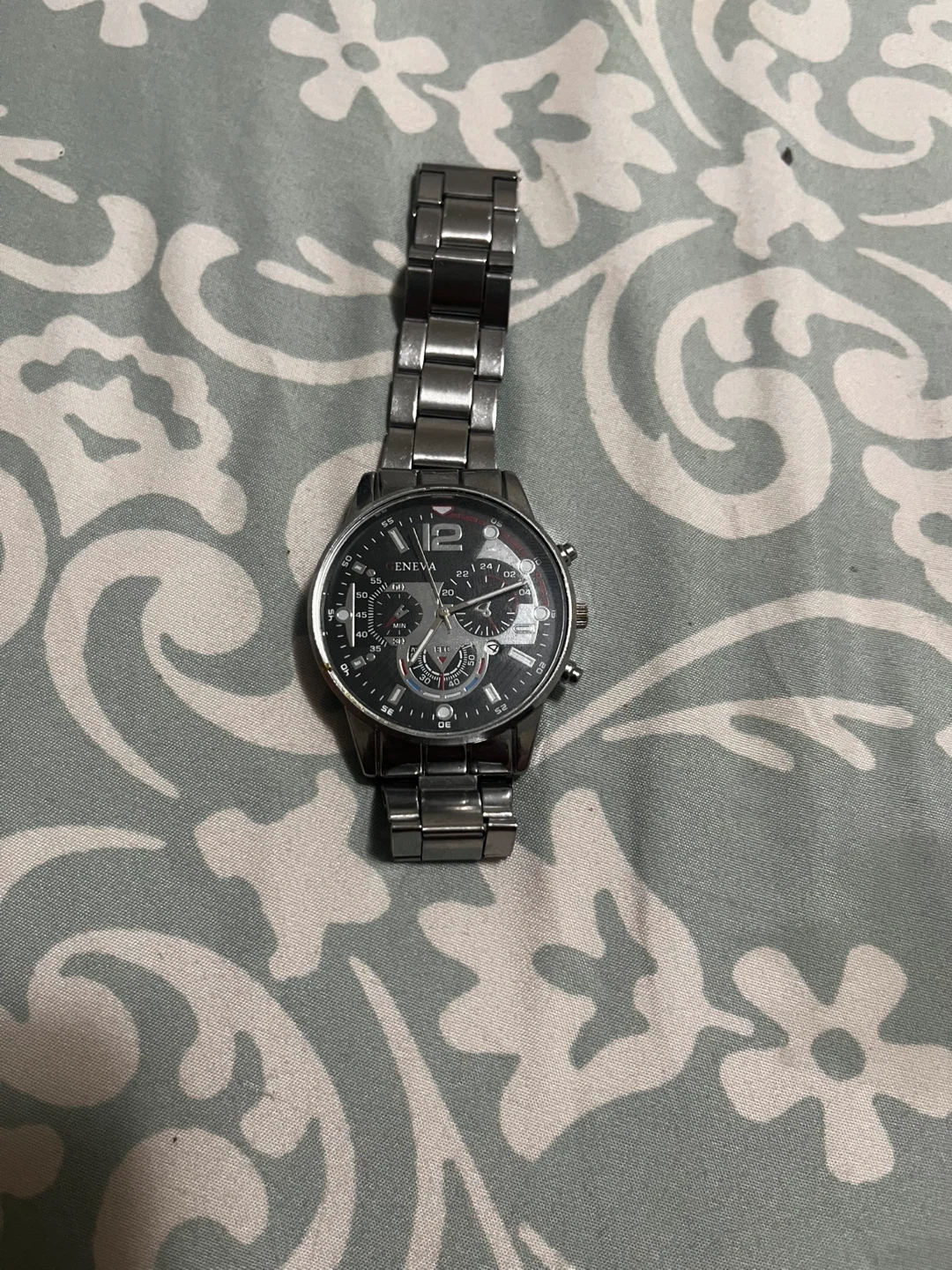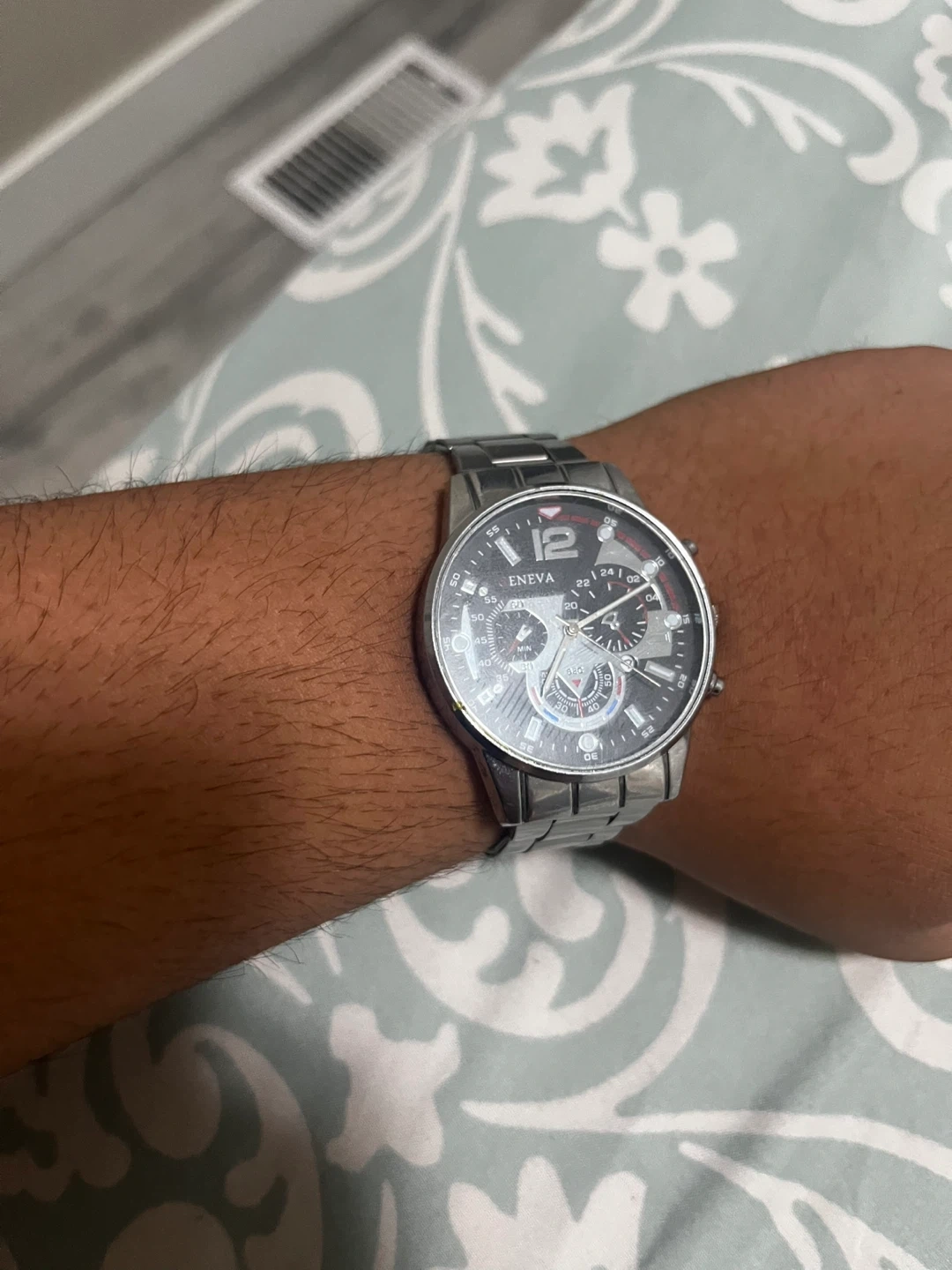 Selling a men's ENEVA watch with a silver band. It's in great condition and ready for a new owner! The watch features a sleek design and is perfect for everyday wear or special occasions