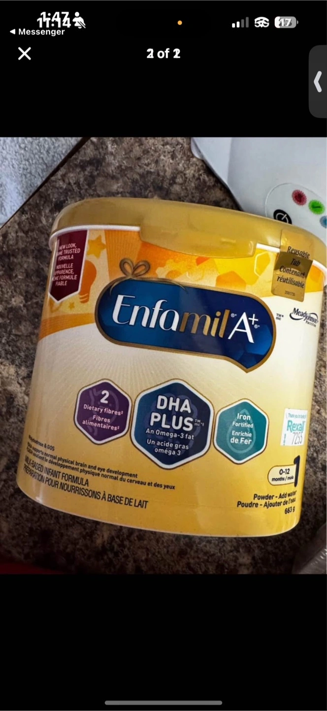 15Selling a container of Enfamil A+ infant formula, suitable for babies aged 0-12 months. It contains DHA Plus and 2 dietary fibres. The formula is milk-based and supports normal physical brain and eye development. It also contains iron to enrich the baby's diet