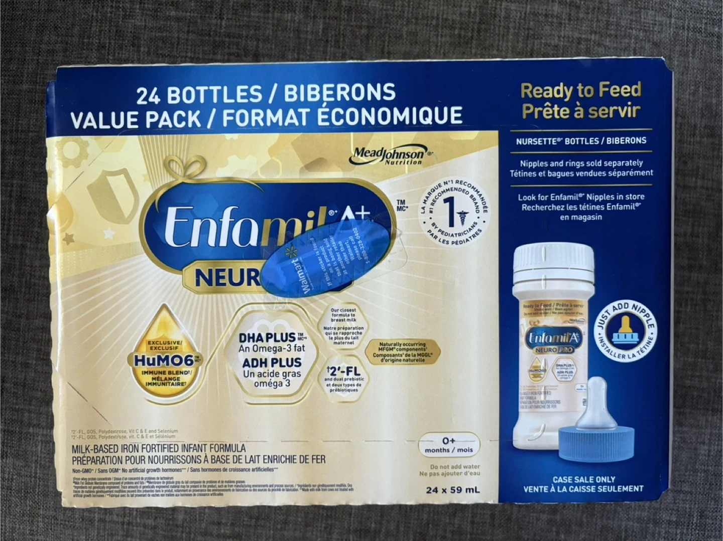 box of Enfamil Ready to Feed formula bottles. This is a value pack containing 24 bottles, each 59mL. Perfect for newborns (0+ months). The formula is milk-based and iron-fortified. New Nepean