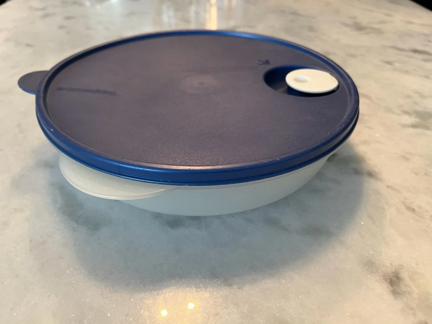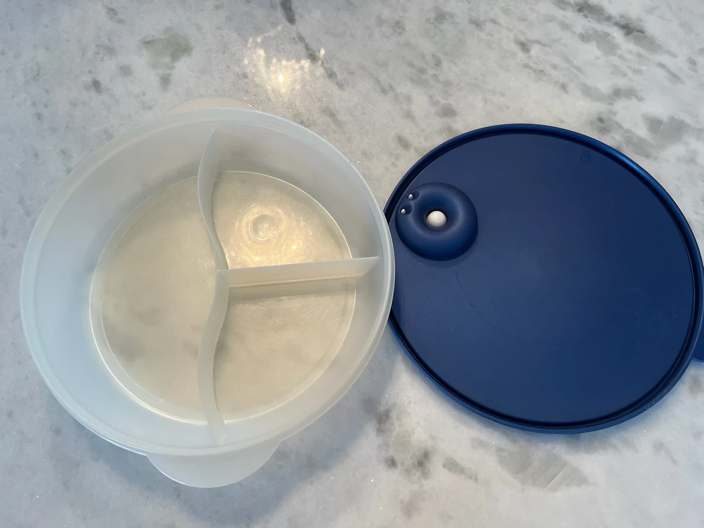 This is a vintage Tupperware divided serving dish with a navy blue lid. It has three compartments for serving different foods. Perfect for snacks or sides!