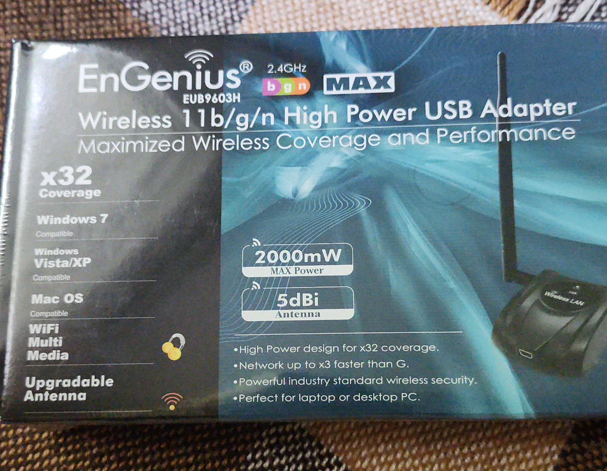 Selling a brand new EnGenius EUB9603H Wireless 11b/g/n High Power USB Adapter. This adapter maximizes wireless coverage and performance. Key features include: - x32 Coverage - Compatible with Windows 7, Windows Vista/XP, and Mac OS - WiFi Multi Media - Upgradable Antenna - 2000mW MAX Power - 5dBi Antenna - High Power design for x32 coverage - Network up to x3 faster than G - Powerful industry standard wireless security - Perfect for laptop or desktop PC