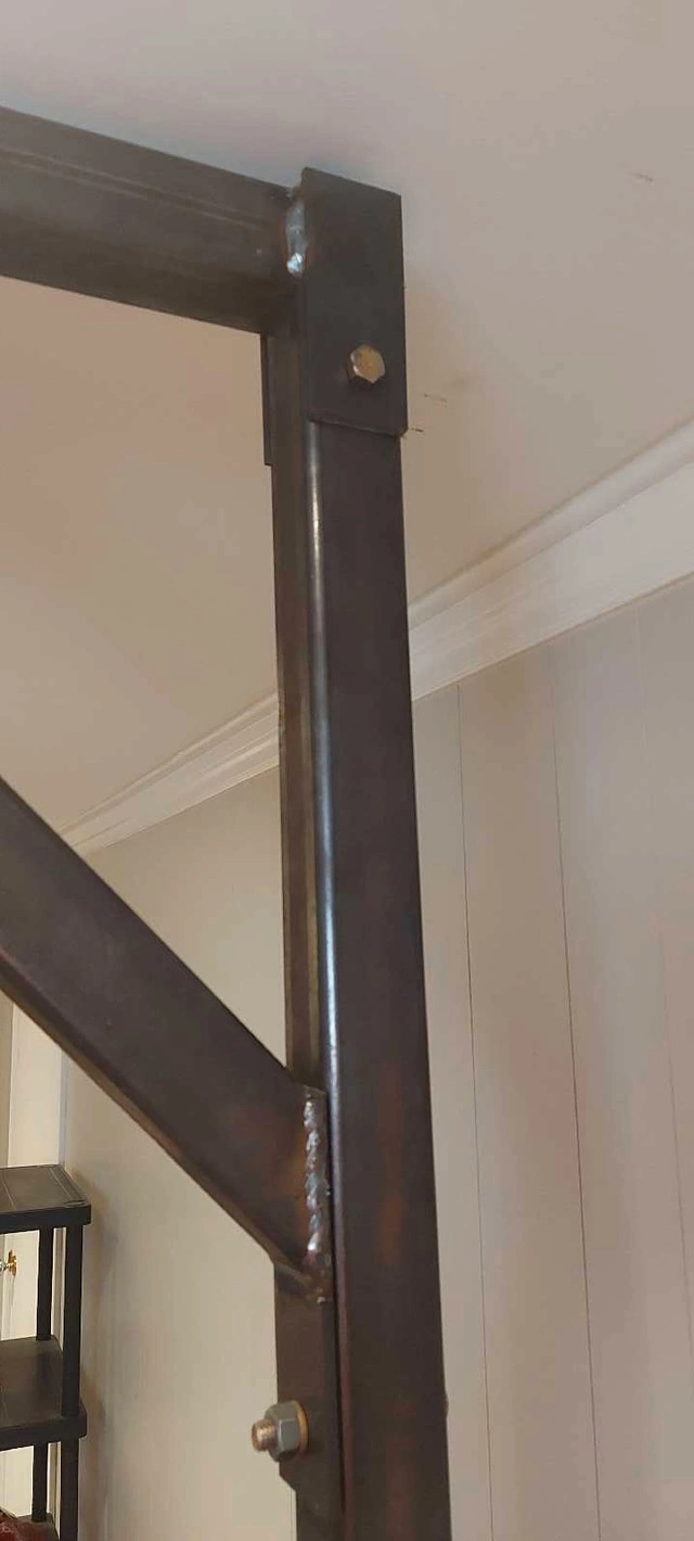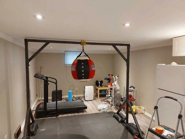 20Made from 2" tubular steel, 5/32" (4mm) thick. Dimensions when assembled: 105" (H) × 96" (W). Base supports are 48" wide, with detachable rubber feet. Comes in 3 sections, which bolt together. I had this custom-built and overbuilt as a punching bag stand, but could easily handle several hundreds of pounds if you attach a winch/pulley (not included). I've used a 150lb heavy bag on it (not included) and the frame stays still regardless of how much the bag swings around. The welder who built it is confident it can handle an engine block, but I make no guarantees as to its maximum weight-bearing load. Wide enough to get the front end of any passenger vehicle, and probably most pickup trucks and vans under it. If you need something big and sturdy to hold a lot of weight, then this is for you.