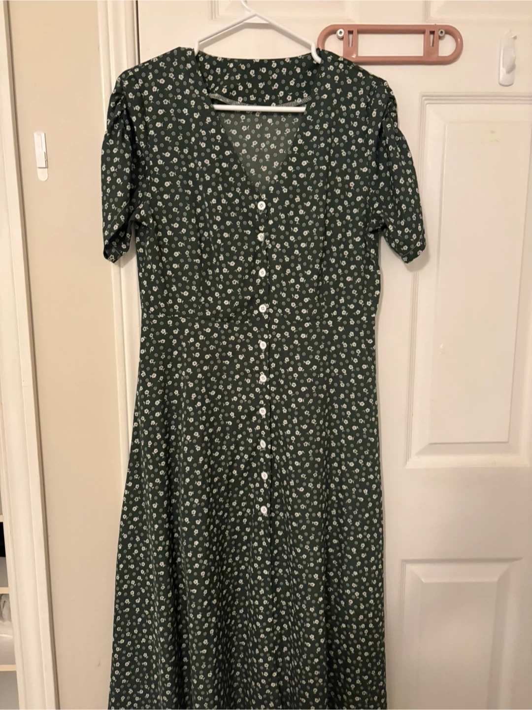 This midi dress features a dark green base with a ditsy white floral print. It has short sleeves and a button-up front. Material feels like a lightweight polyester blend.