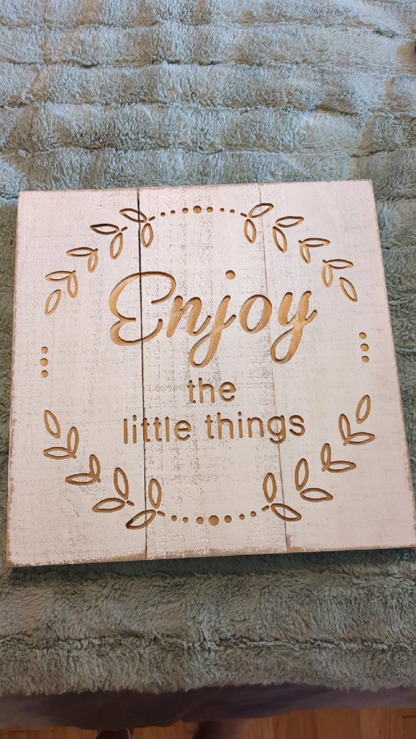 A cute wooden sign that says "Enjoy the little things" in a decorative font. It's perfect for adding a touch of warmth and positivity to any room in your home. It's in great condition and ready to find a new home 37 x 37 cm wide and length
