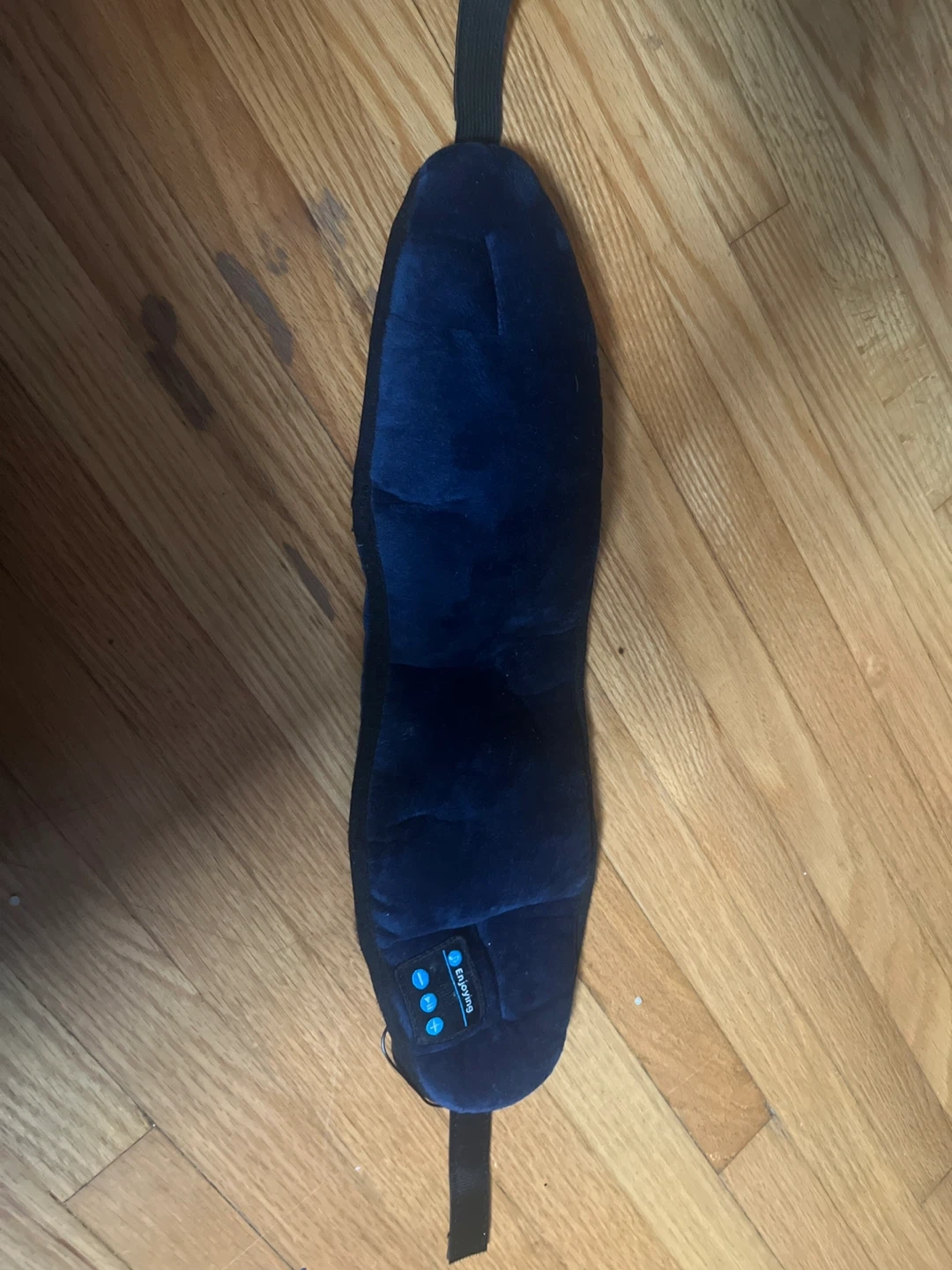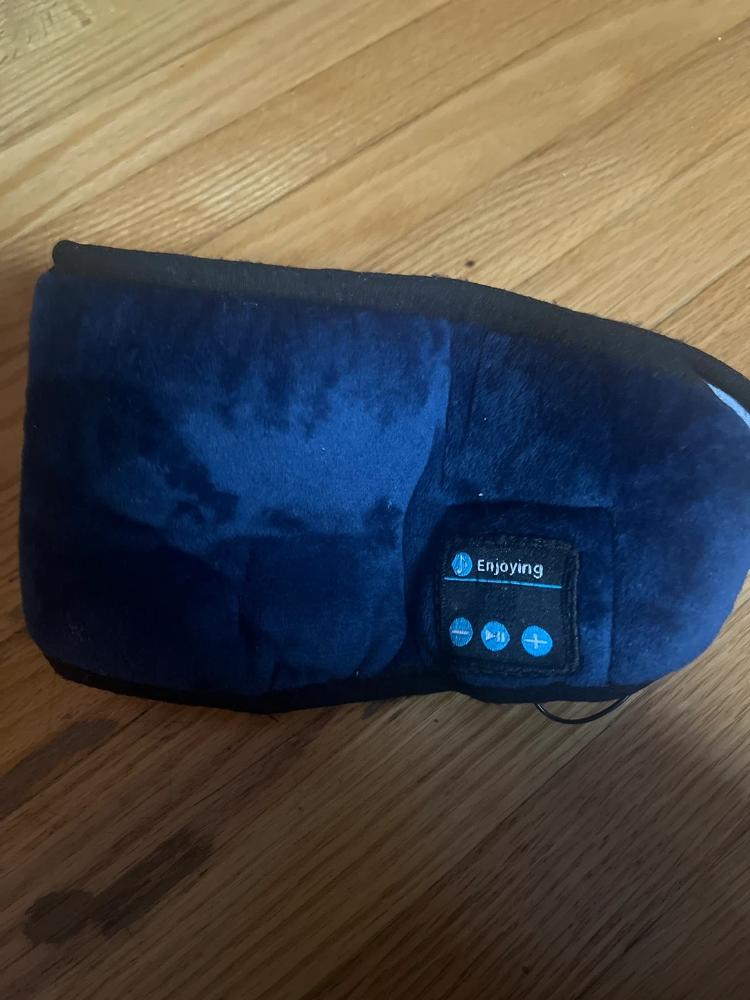 Enjoy a relaxing sleep with this Bluetooth eye mask! It's a dark blue colour and looks to be in great condition. The mask has a small control panel with the word 'Enjoying' on it. Perfect for blocking out light and listening to music or podcasts as you drift off to sleep