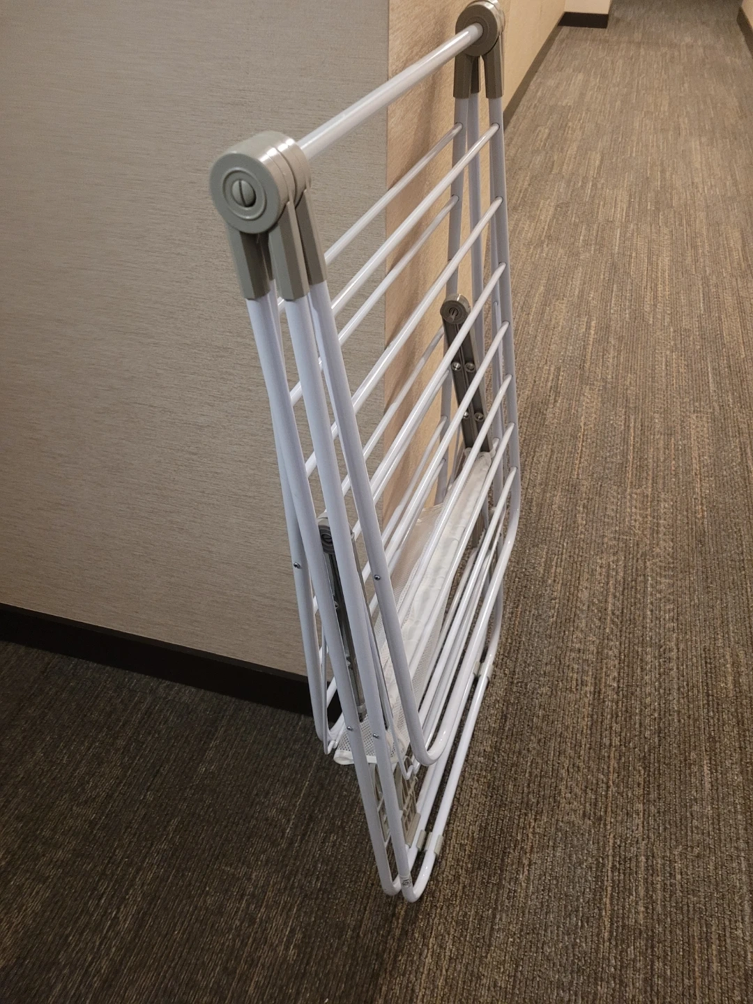 This white foldable clothes drying rack is perfect for air-drying laundry. It's lightweight and easy to store when not in use. This rack offers ample space for hanging clothes, towels, and more.