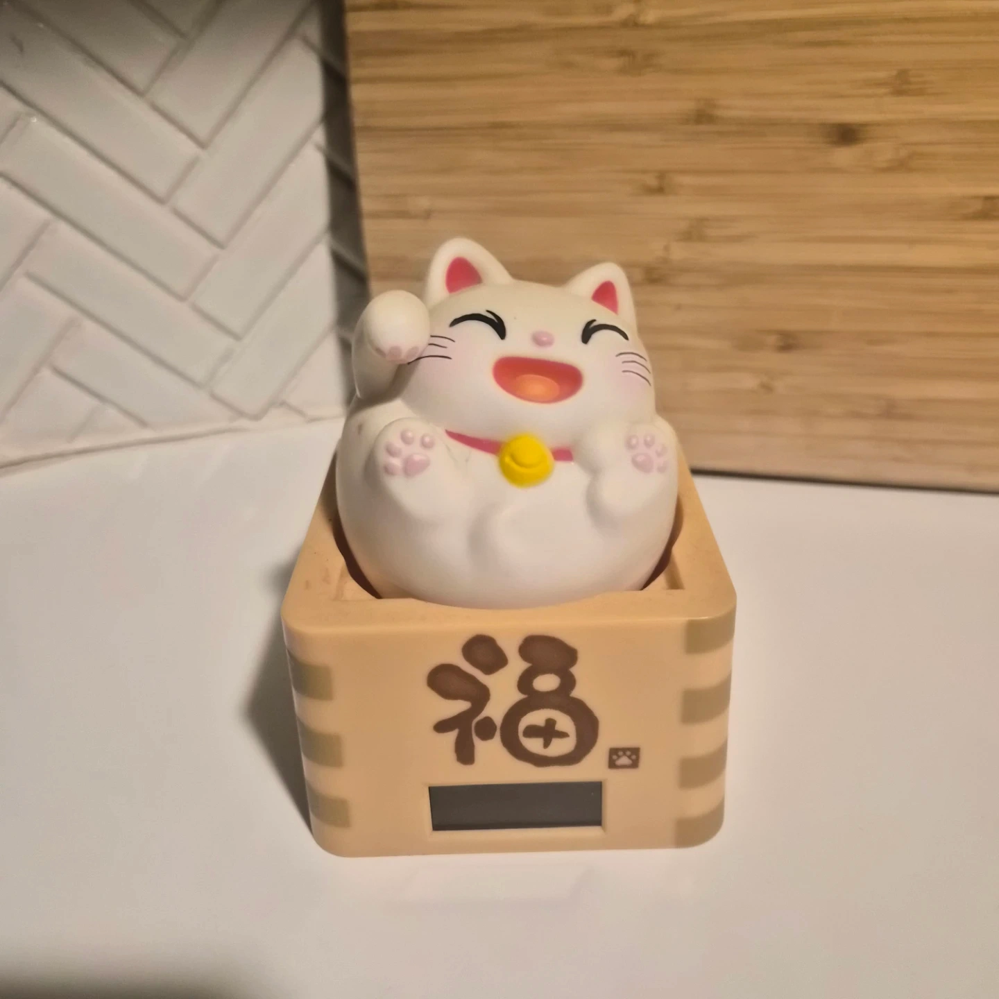 This solar powered Maneki Neko waving cat figure sits in a tan box with Japanese characters and rocks back and forth when displayed in a sunny room. It's a fun decoration for a desk or shelf, purchased in Japan 3 years ago.