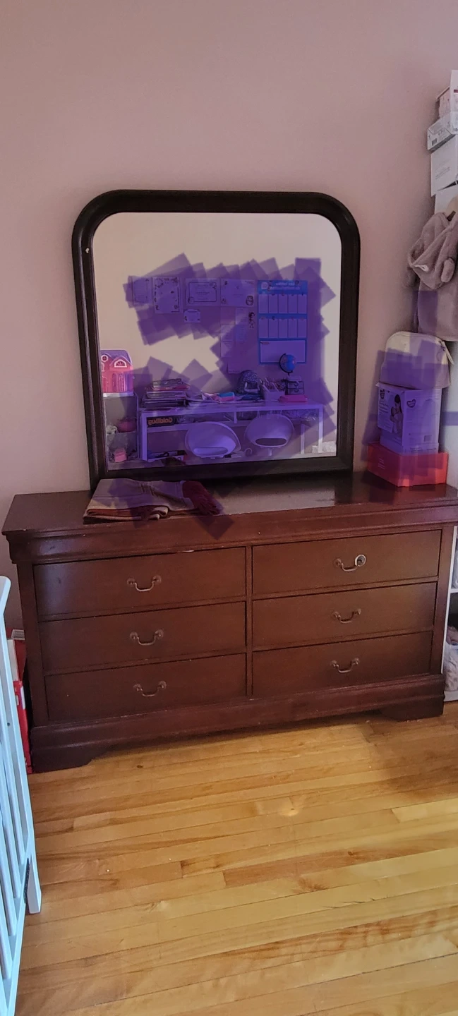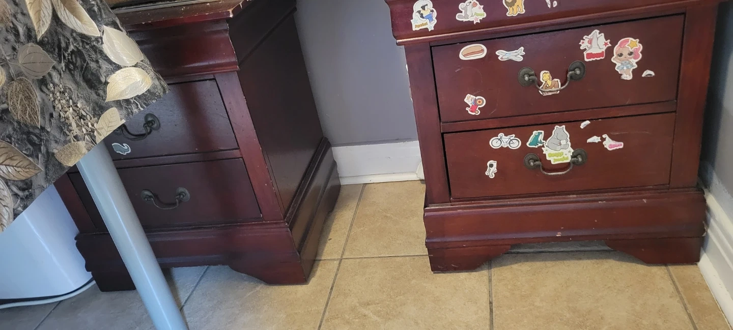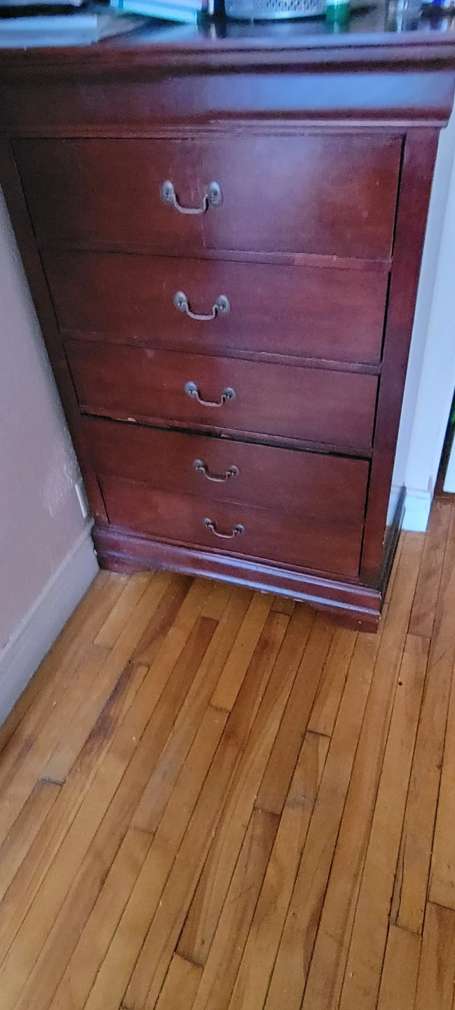 20Je vends un ensemble de chambre à coucher antique. Il comprend une commode avec miroir, deux tables de chevet et une commode verticale. Les meubles sont en bois foncé et ont des poignées en métal. Ils ont quelques égratignures et marques d'usure, mais ils sont en bon état général.