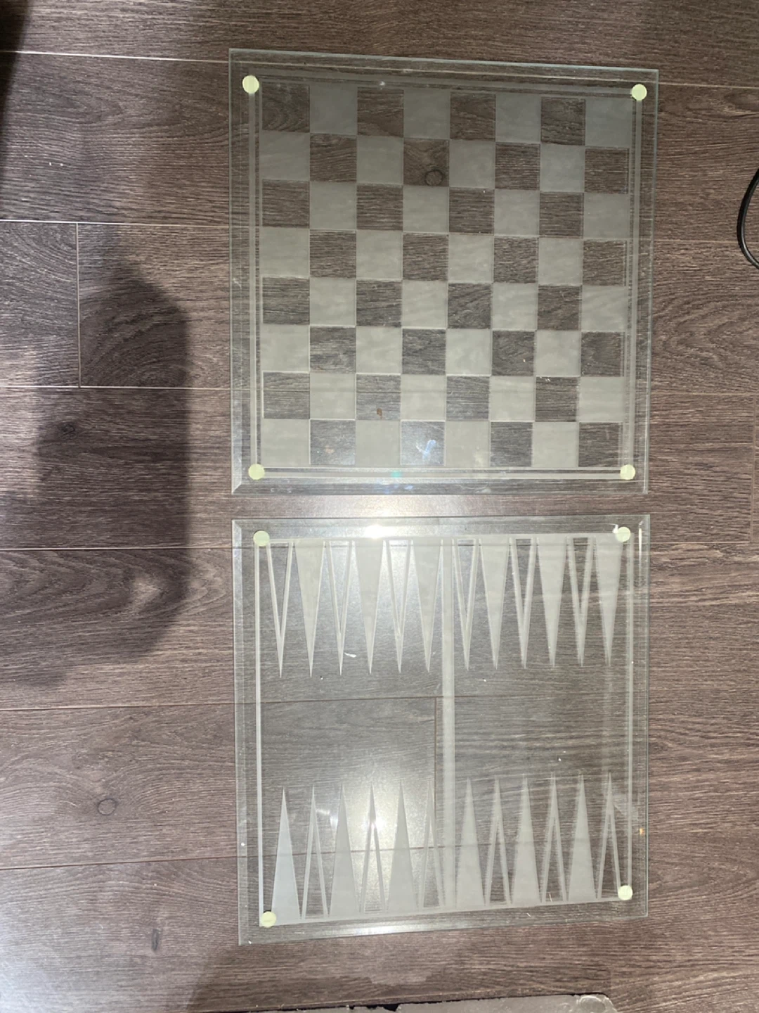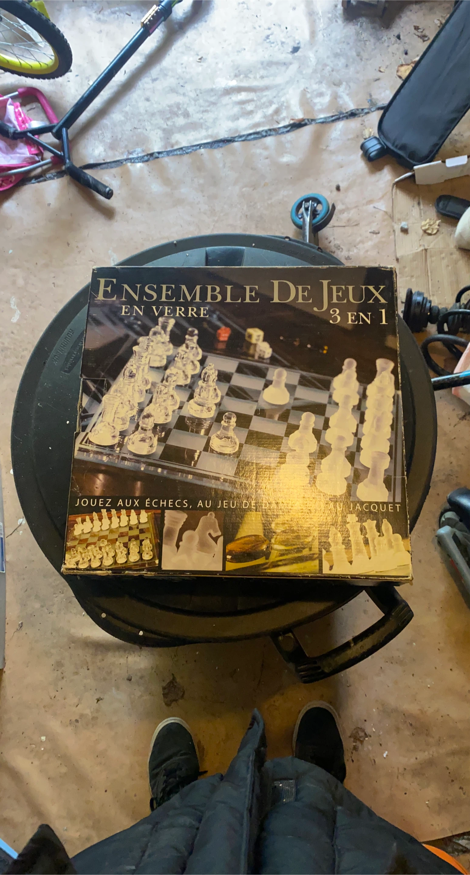 Selling a glass chess set, "Ensemble De Jeux En Verre 3 En 1". Perfect for game nights!