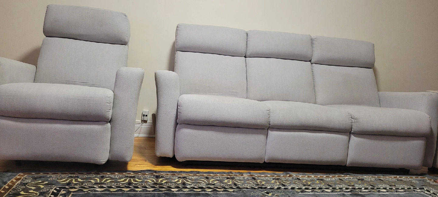 20Je vends un ensemble de sofa et fauteuil inclinables de couleur grise. Ils sont en bonne condition et très confortables pour se détendre à la maison. Parfait pour un salon ou une salle familiale!