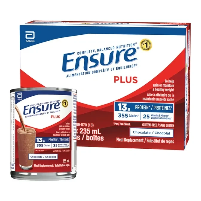 10I have Ensure Plus vanilla, Chocolate or strawberry meal replacement shakes. Each serving contains 13g of protein and 25 vitamins and minerals, with 355 calories per 235ml can. They're also gluten-free! Perfect for gaining or maintaining a healthy weight