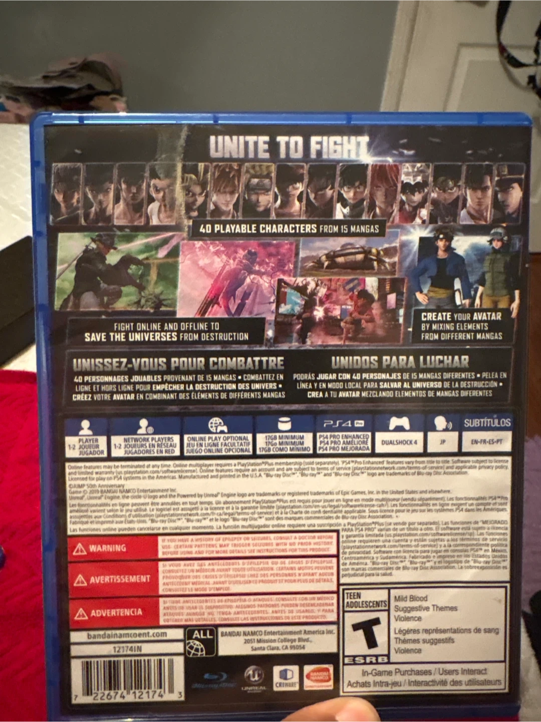 Unite for battle online and offline to save the universe from destruction. Jump Force features 40 playable characters from 15 mangas. Create your avatar by mixing elements from different mangas. For Teen Adolescents with Mild Blood Suggestive Themes and Violence.