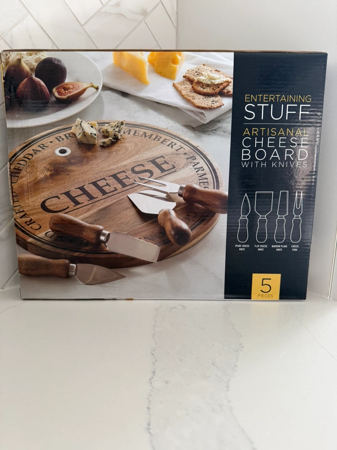 73Selling a brand new 'Entertaining Stuff' artisanal cheese board with knives! This set includes a durable acacia cheese board and four stylish cheese knives with matching acacia wood handles. The board features a reinforced hanging hole for easy storage. The dimensions are 28 cm dia. x 2 cm tall (11" dia. x 0.75" tall).