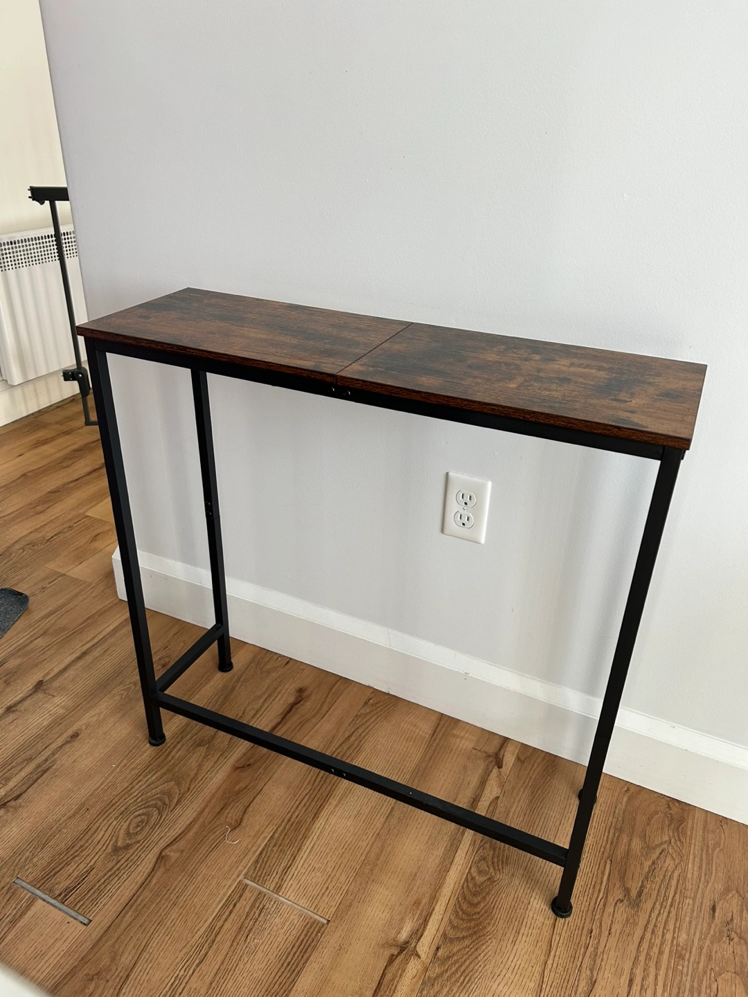 Narrow console table. Dark brown wood-look top. Black metal frame. Simple design. Perfect for entryway or small space. 30x30x10