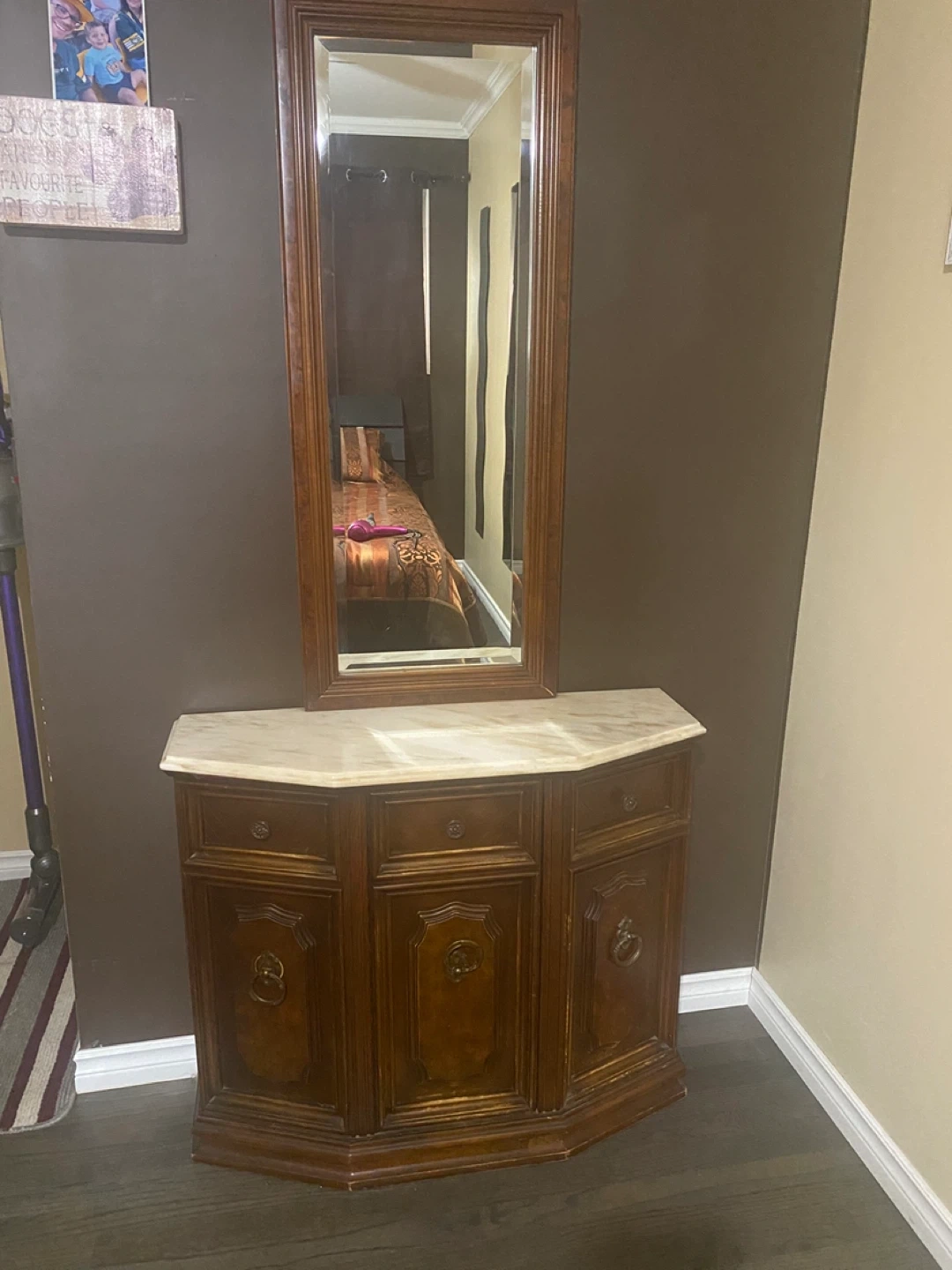 10Elegant entryway table with an attached mirror. It features a beautiful marble top and a classic wood finish. Perfect for adding a touch of sophistication to your home's entrance!