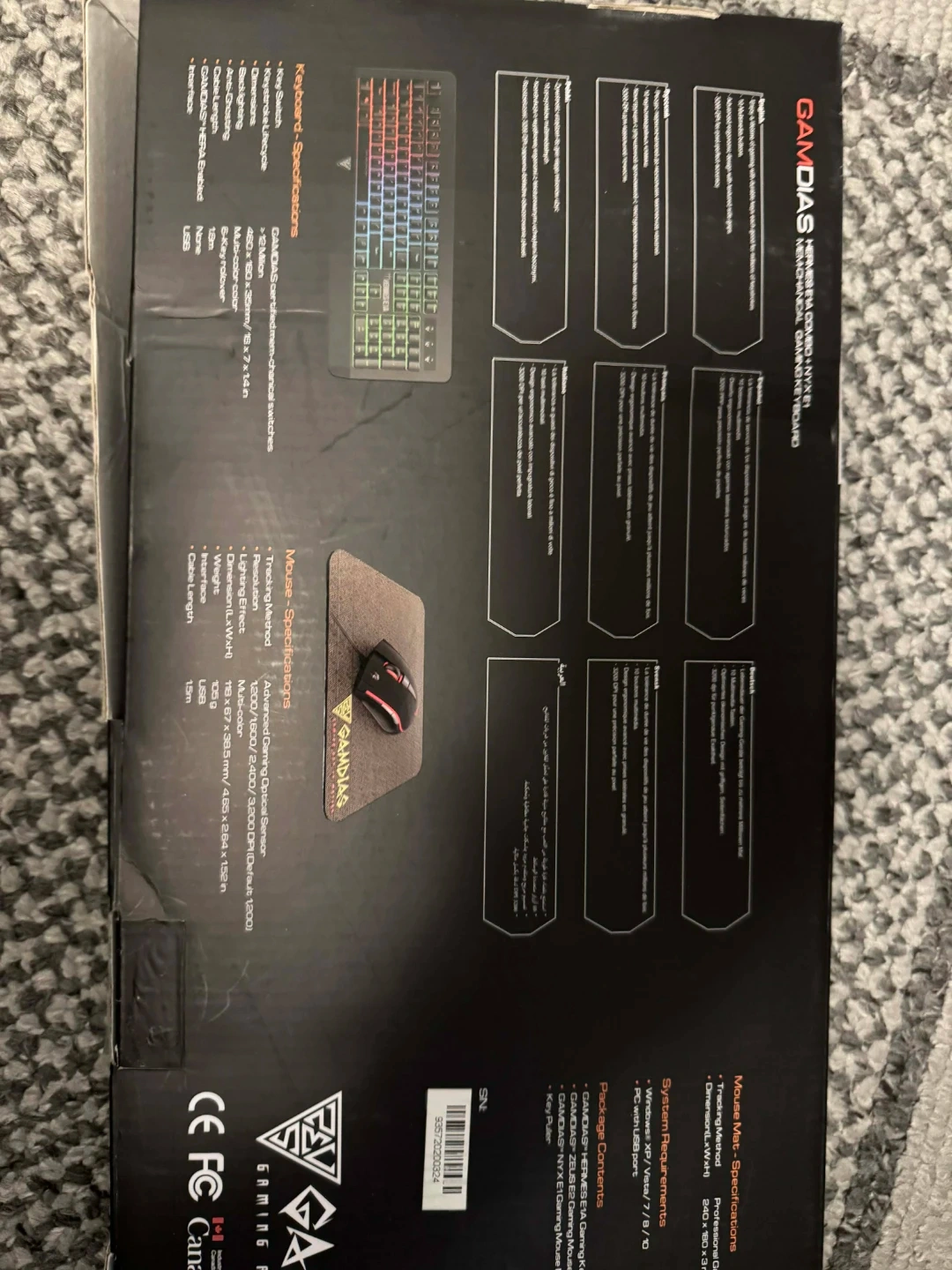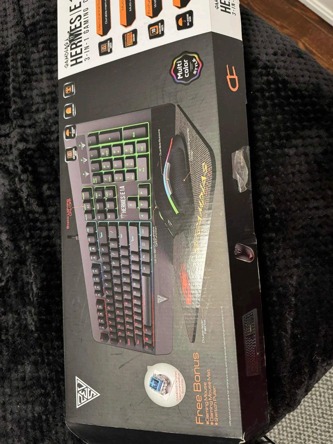 This is a Gamdias Hermes E1 3-in-1 gaming combo. It includes a keyboard, a gaming mouse, and a mousepad. The keyboard features multi-color lighting. This set is great for PC gamers looking for an affordable upgrade.