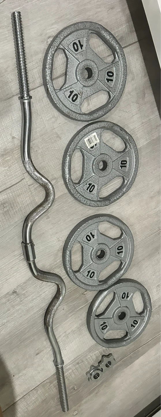 This set includes a curl bar and four 10 lb weight plates. They're made of durable metal and ready for your workouts. The curl bar's shape targets arm muscles effectively.