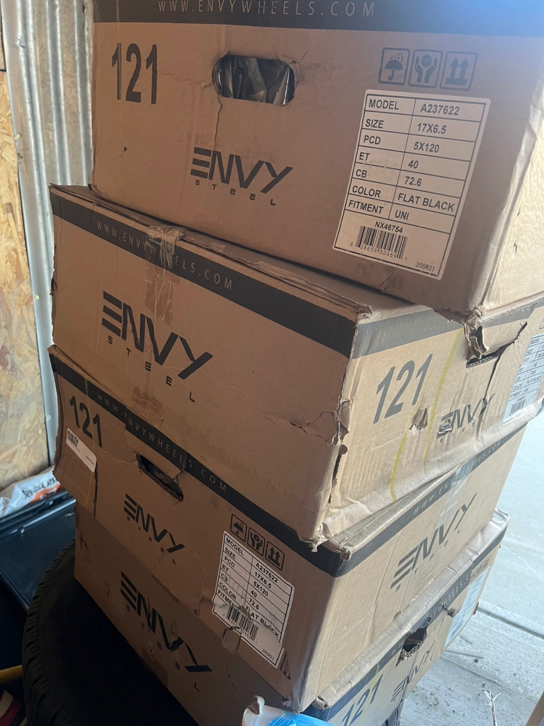 Selling a set of Envy Steel wheels, brand new in the box! They're a flat black colour and the size is 17” Here are some additional specs: - Model: A237622 - Bolt pattern is 5x120 - ET: 40 - CB: 72.6 - Fitment: UNI