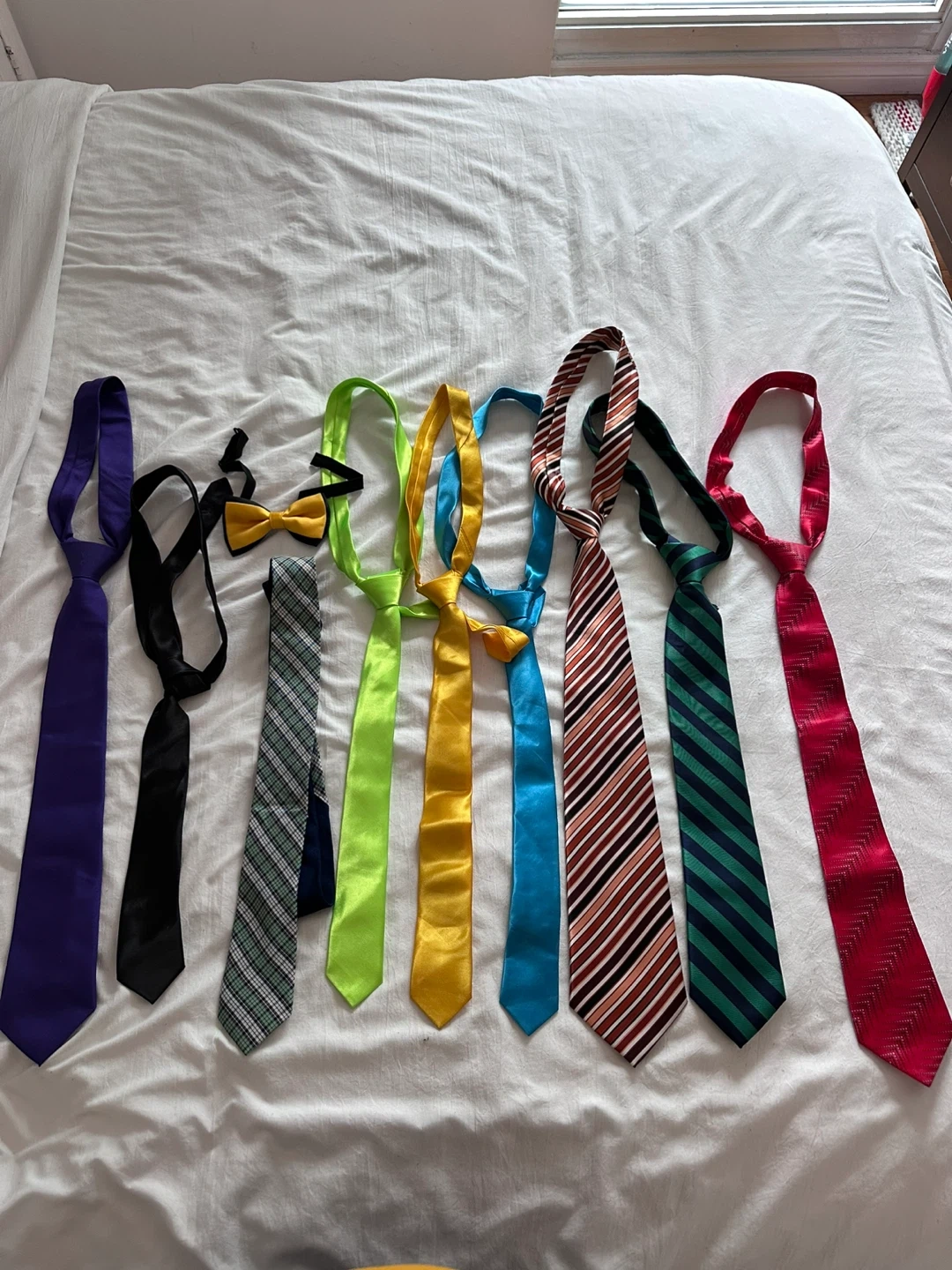 A collection of eight neckties in various colours and patterns, including solid purple, black, lime green, yellow, and blue, along with two patterned ties and a yellow bowtie. Most ties appear to be made of polyester or a similar synthetic material, suitable for dressing up an outfit. Great for adding some variety to your formal wear collection!