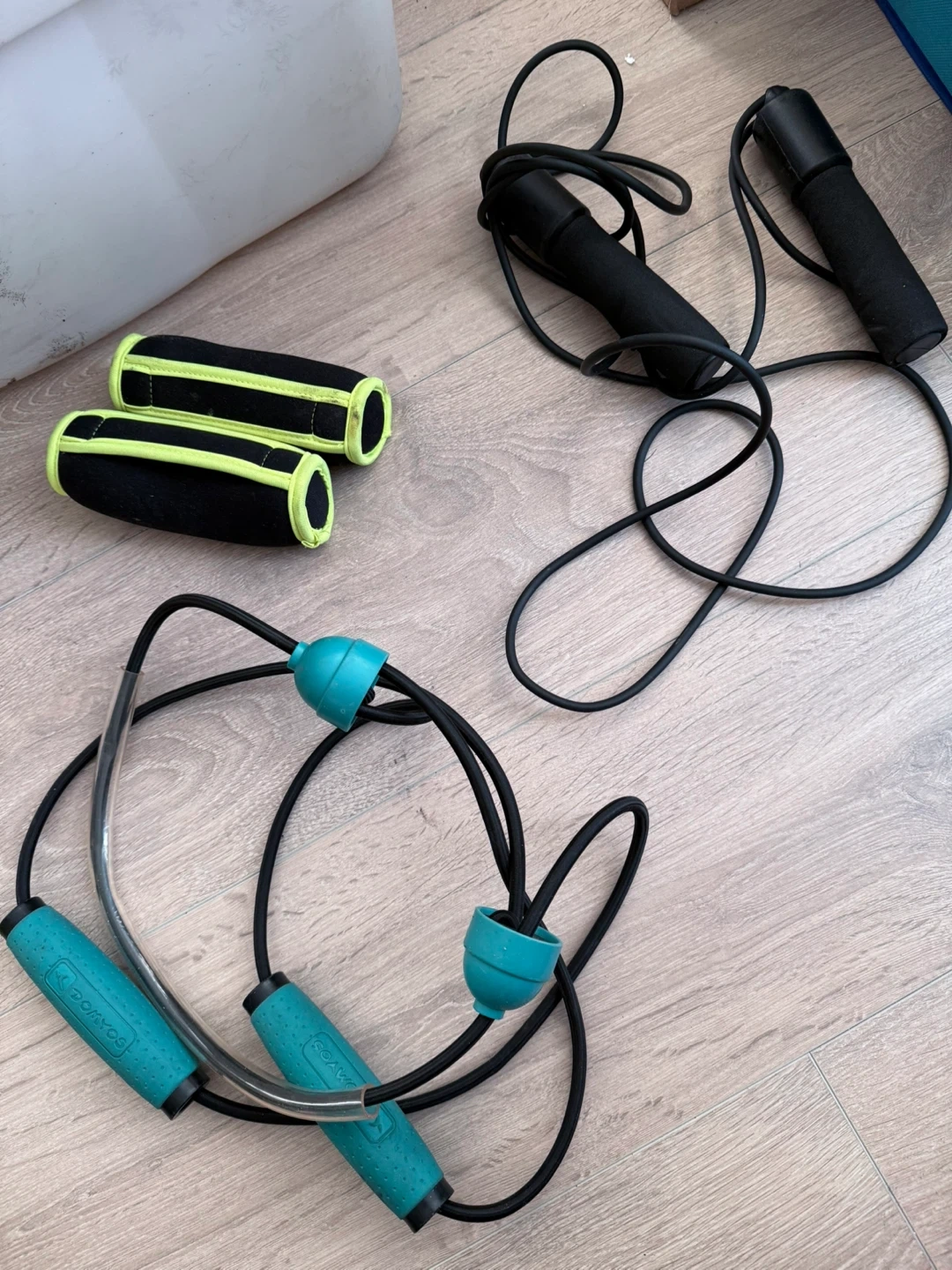 Includes one speed jump rope with teal handles and a separate black jump rope with black handles. Also comes with a pair of black and neon yellow padded wrist weights. Great for cardio and strength training!