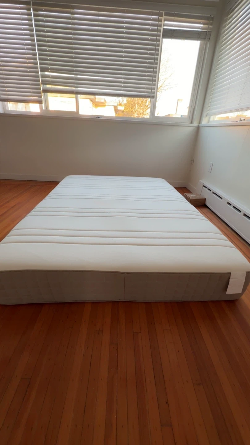 This IKEA HAUGESUND mattress is made with polyurethane foam and polyester fiber. It was manufactured on April 3, 2023. It's a comfortable option for a good night's sleep.