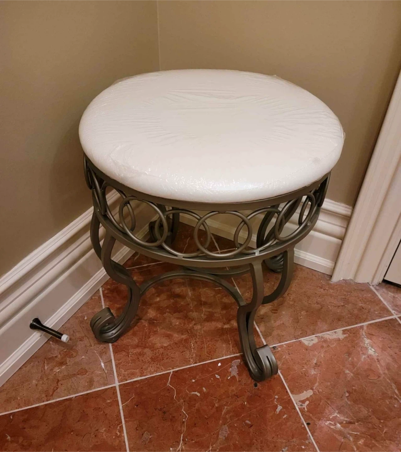 Round vintage white upholstered vanity stool in mint condition. Features carved metal legs. Can be used as a foot stool or an ottoman as well.