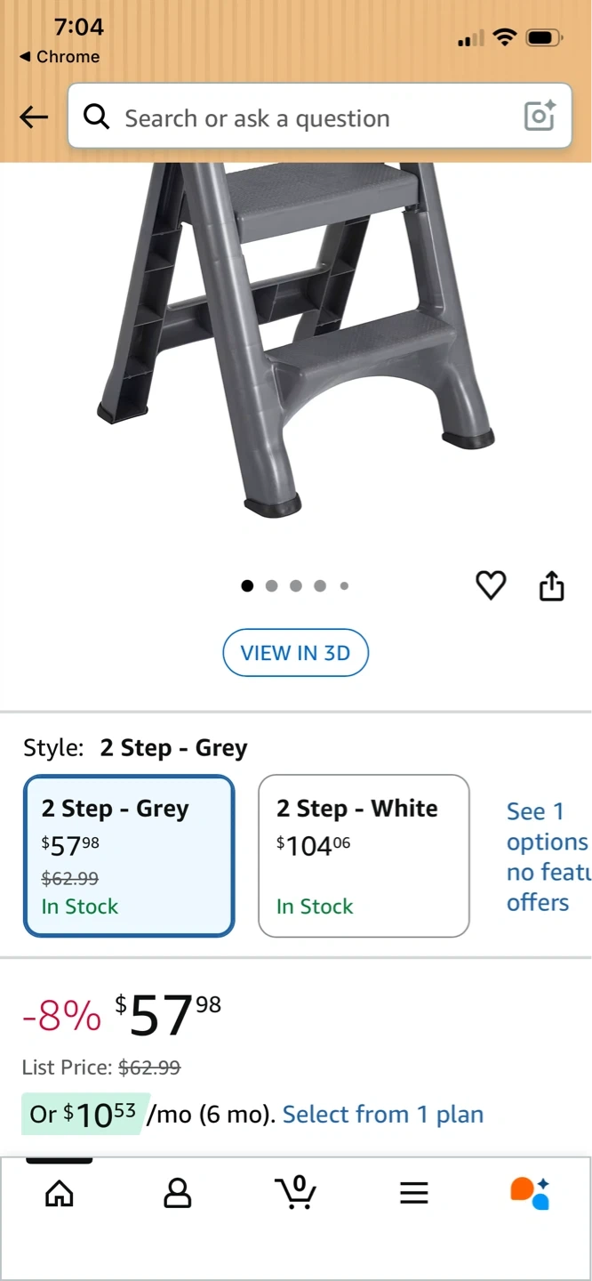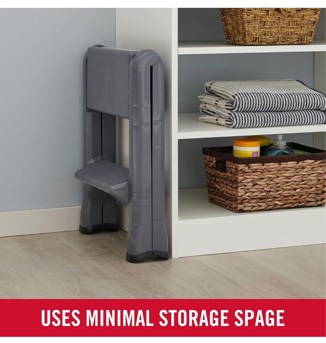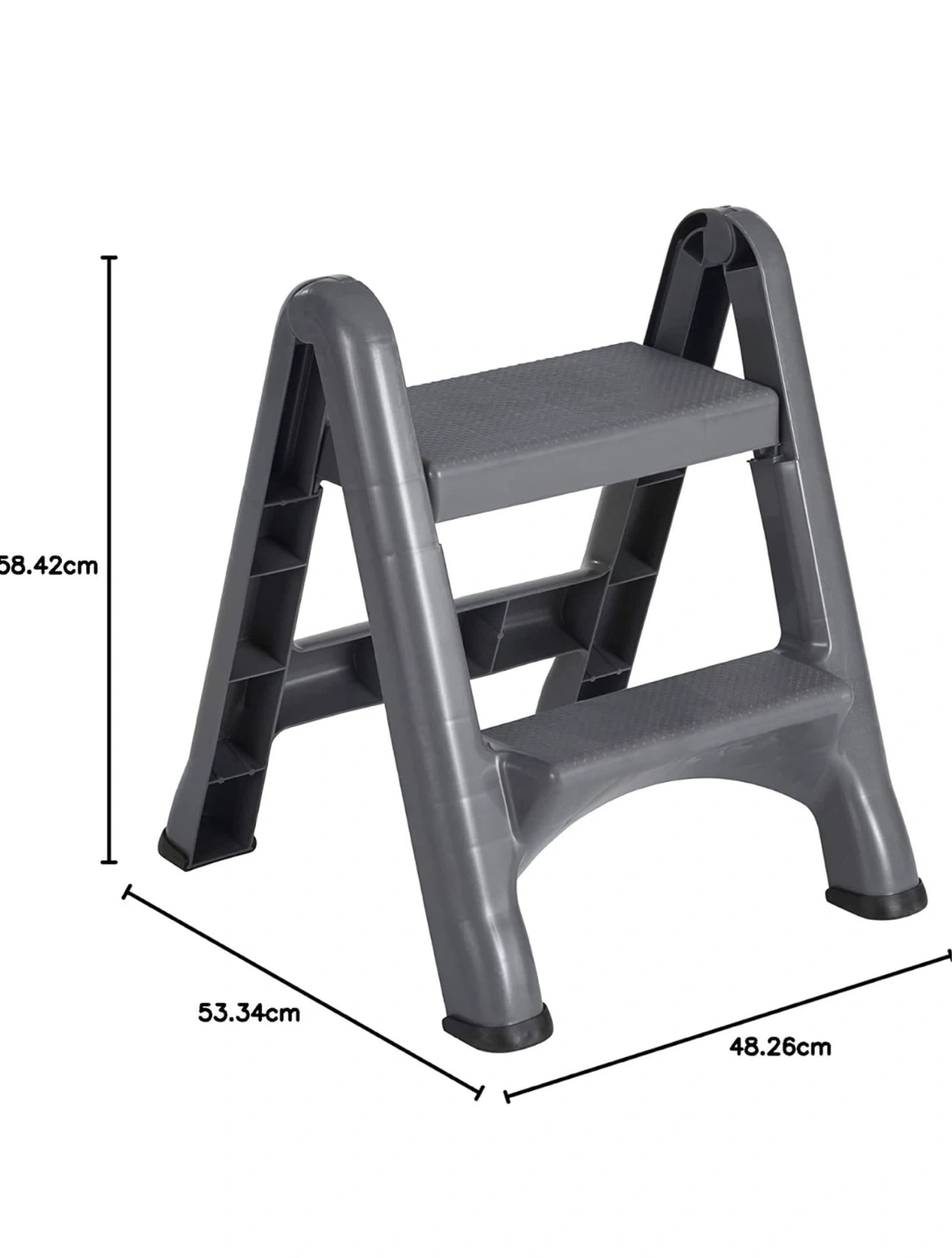 This grey 2-step stool folds for minimal storage space. It's made of plastic. Dimensions: 58.42cm high x 53.34cm wide x 48.26cm deep.