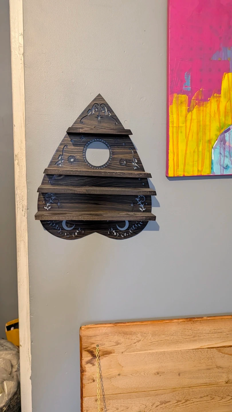 This decorative shelf is designed in the shape of a ouija board planchette with gothic-like vibes & designs. It's perfect for displaying small curios, small trinkets or crystals. Made of wood with a dark finish. Approximately 15" tall and as wide as 12" each shelf is approximately 2.5" deep. Only had this hung up for a short period of time before it was tucked into storage so it's basically brand new, in great condition & it needs a new home.