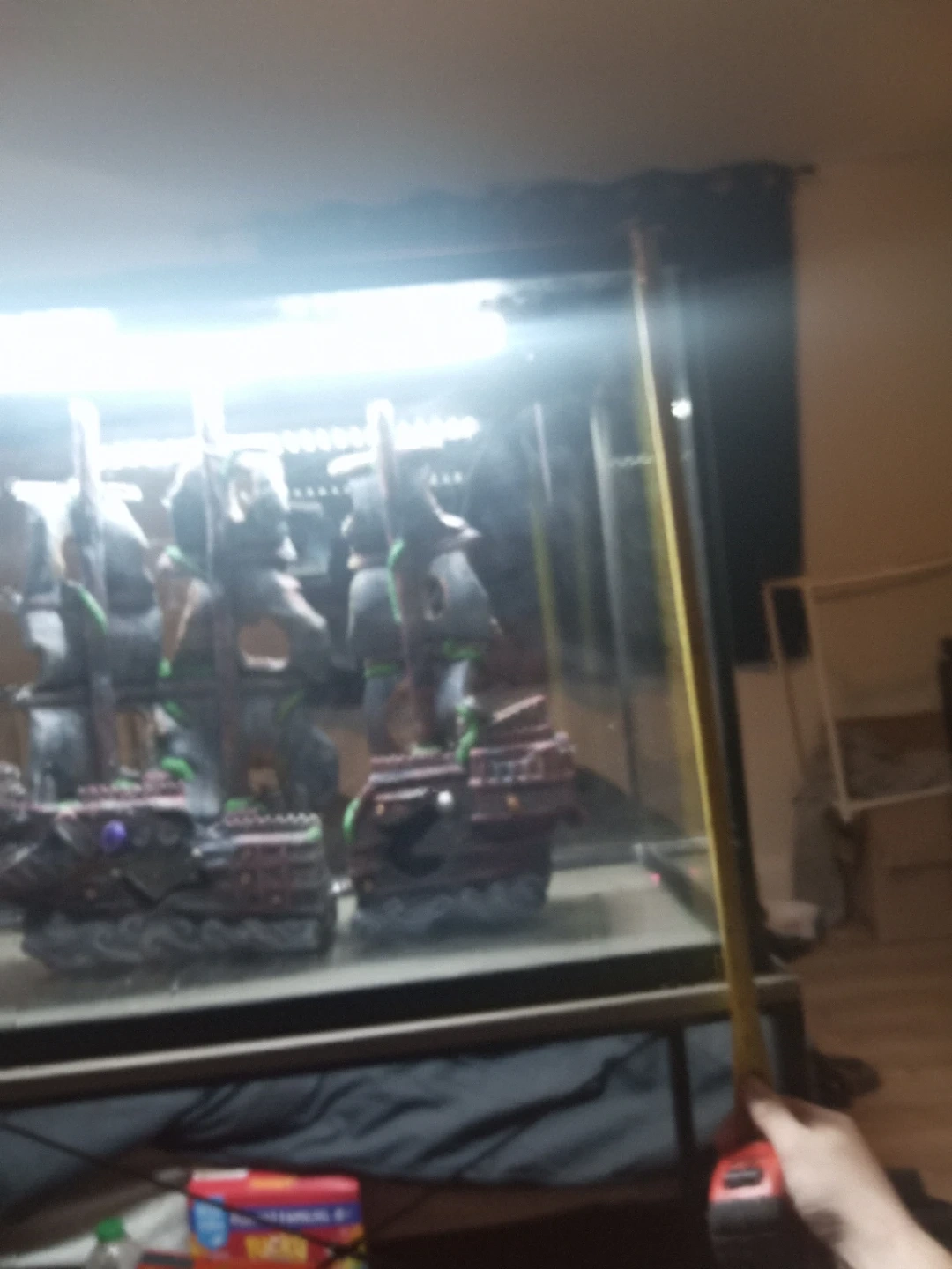Large aquarium tank complete with two detailed pirate ship decorations. It's perfect for creating an underwater scene! Comes with a lid and built-in lighting. NO LEAKS Can deliver for full price.