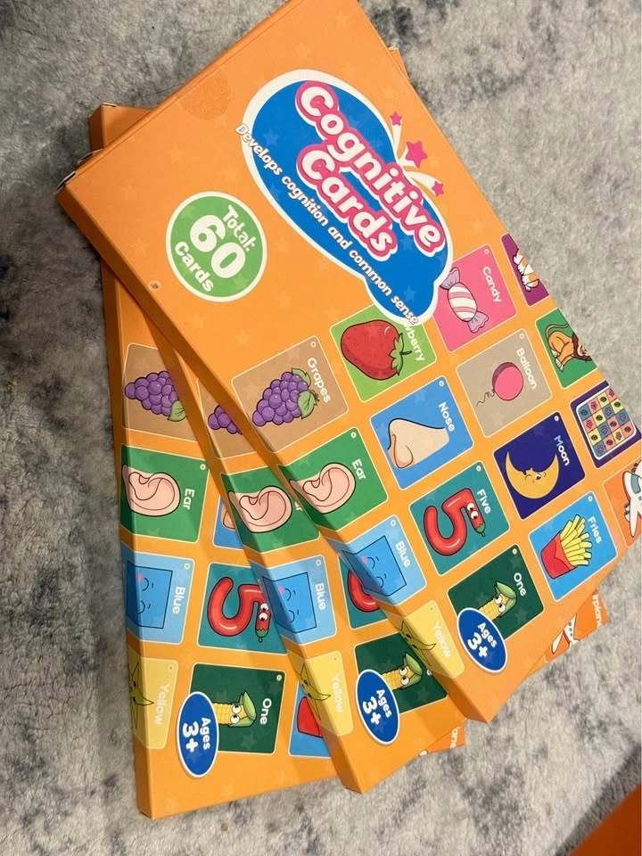 Colorful learning flashcards for toddlers and kids. This set has 60 cards total. It includes categories like alphabet, numbers, colors & shapes, animals, first words, body parts, and foods. Cards are about 10cm x 12.5cm (3.9in x 4.9in). Comes with rings to keep them organized. Great for enhancing cognitive abilities and memory. I have 3 sealed sets available. Box condition: giftable. Pick up from Etobicoke or downtown Union Station.