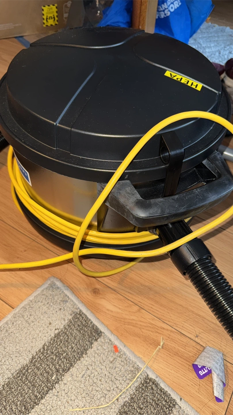 It was bought for a job but it was only used for 2 hours, it is new, it is delivered in its box with all its accessories additionally 10 filters are delivered.This vacuum features a HEPA filter for effective dust capture. It has a durable stainless steel canister. The bright yellow power cord is easy to spot. It's suitable for workshops or garages.