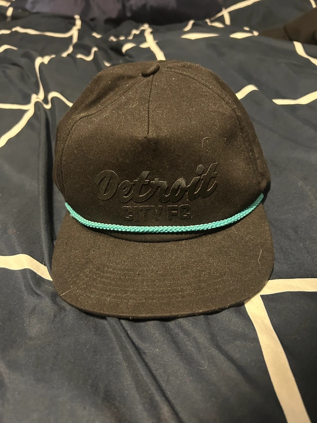 Black snapback hat with a teal rope accent. Features 'Detroit' and 'CITY FC' embroidered on the front. Adjustable strap in the back.