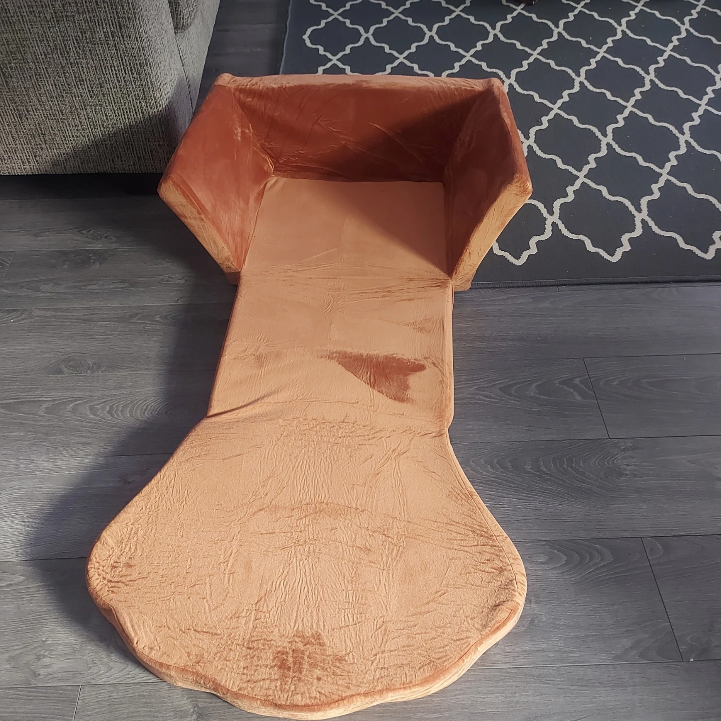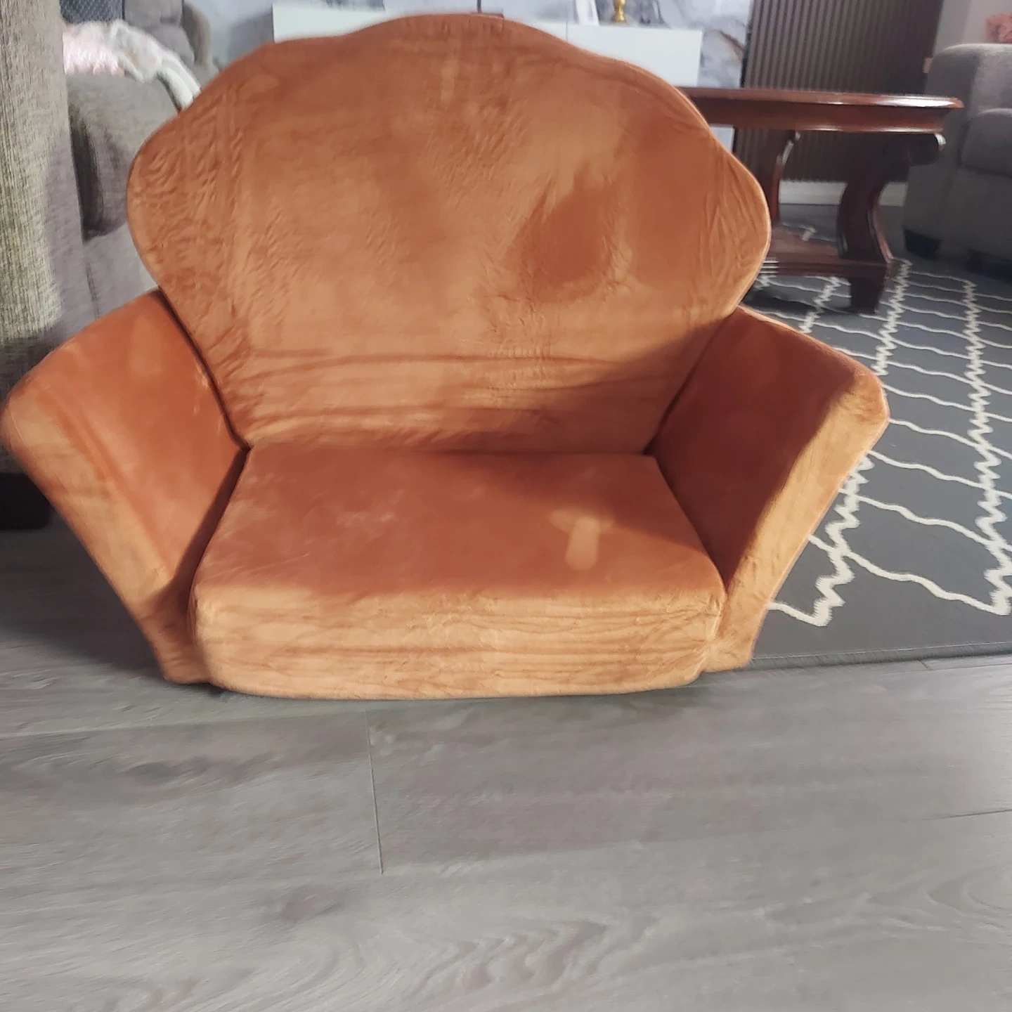 Comfy kids armchair with a matching ottoman. It's upholstered in soft orange velvet fabric. Perfect for a playroom or a child's bedroom!