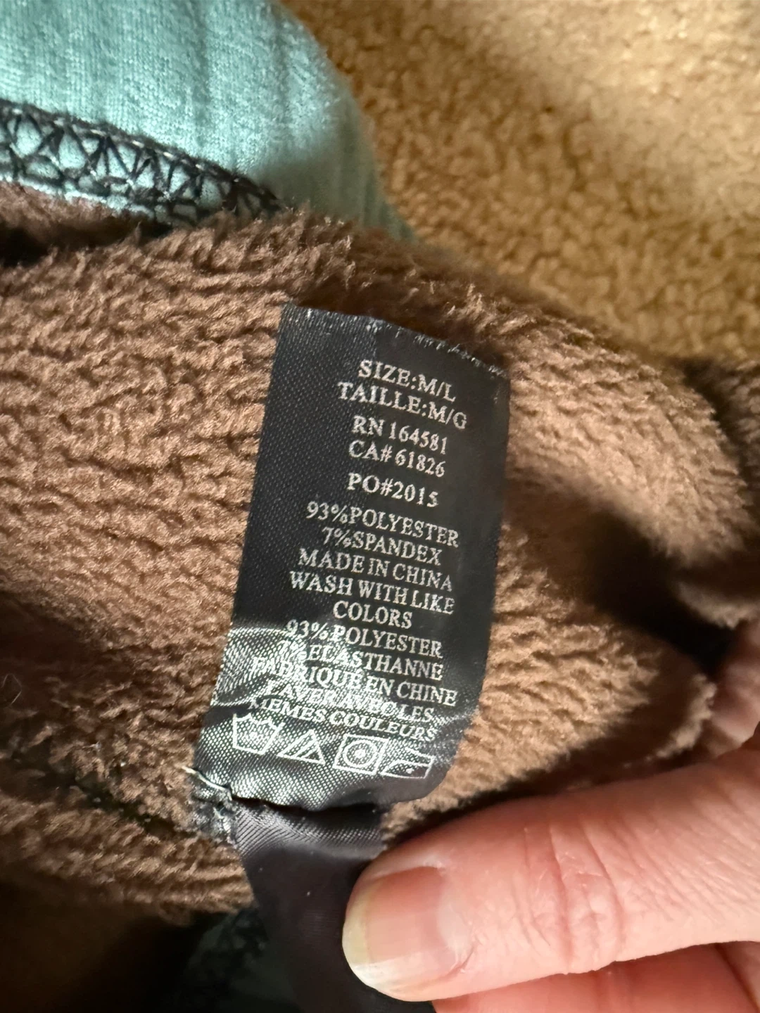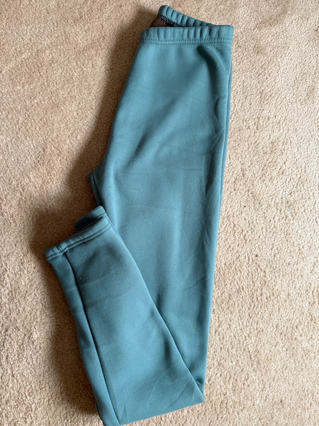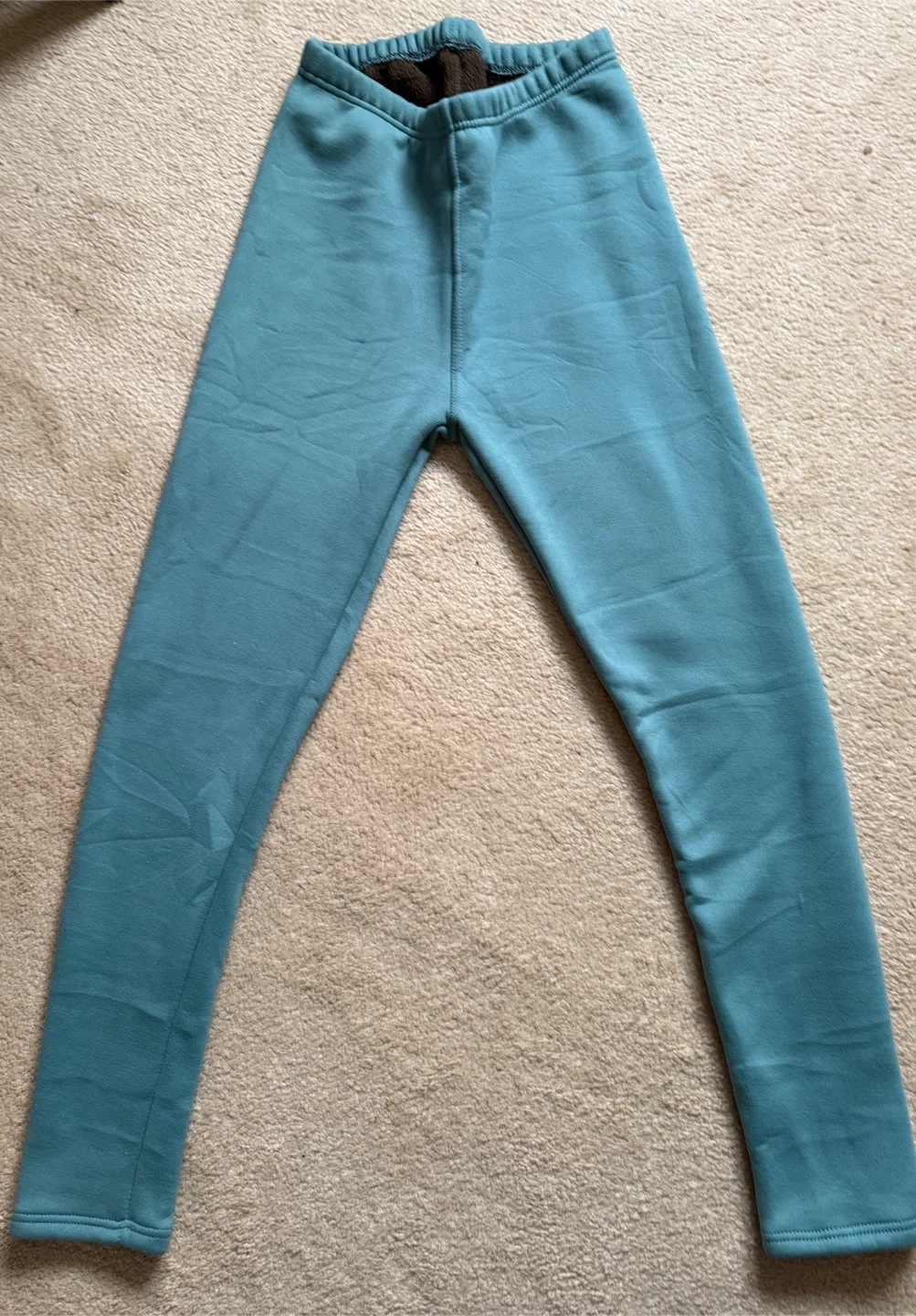 Cozy fleece-lined sweatpants in a teal colour. Made with 93% polyester and 7% spandex. Wash with like colours.
