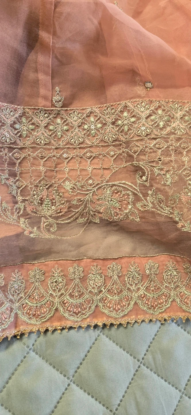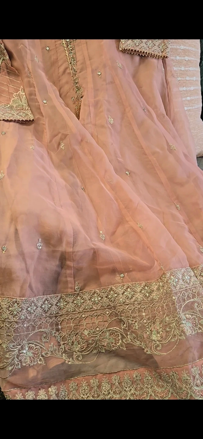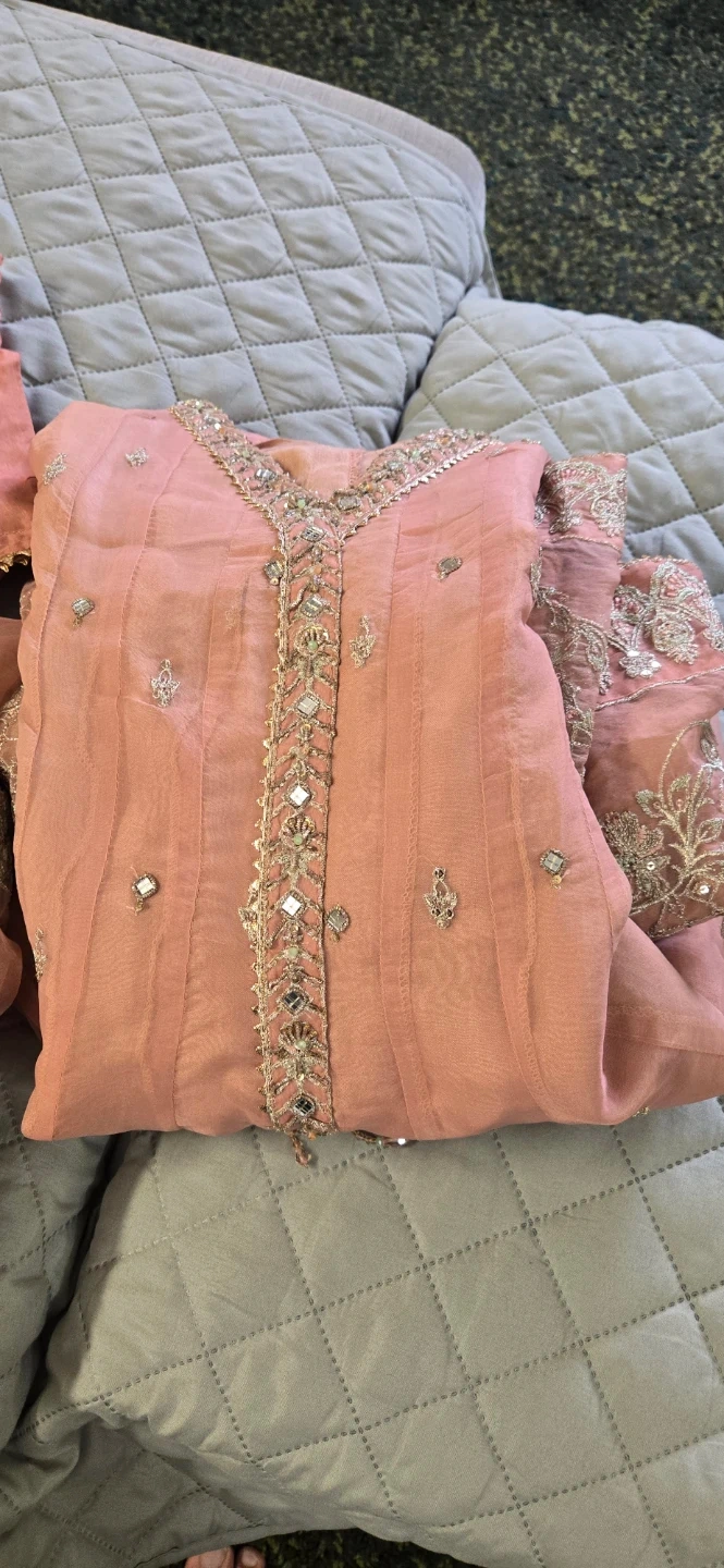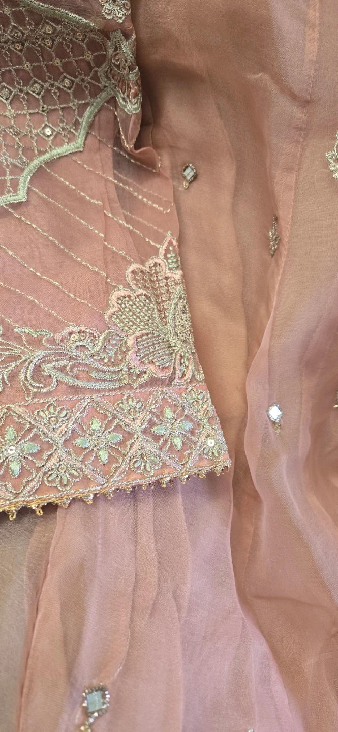 Beautifully detailed pink dress featuring intricate embroidery and small mirror accents. It's made with a combination of sheer organza overlay and a solid lining. The sleeves and neckline are adorned with delicate silver and green threadwork and sequin details. Perfect for festive occasions or formal wear!