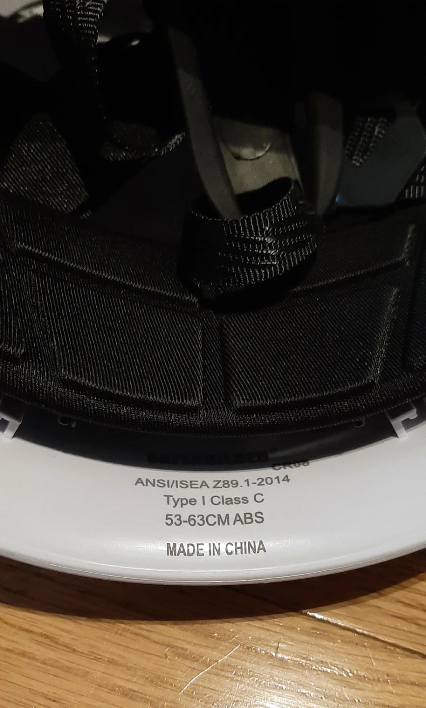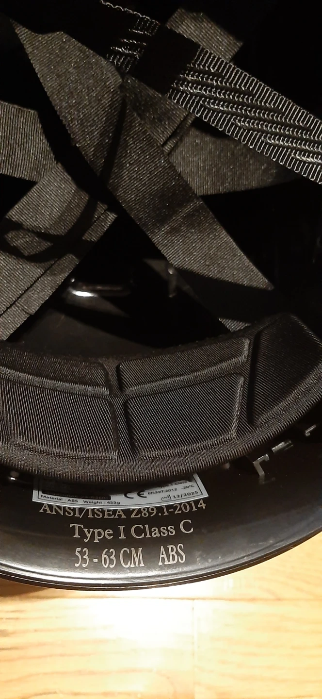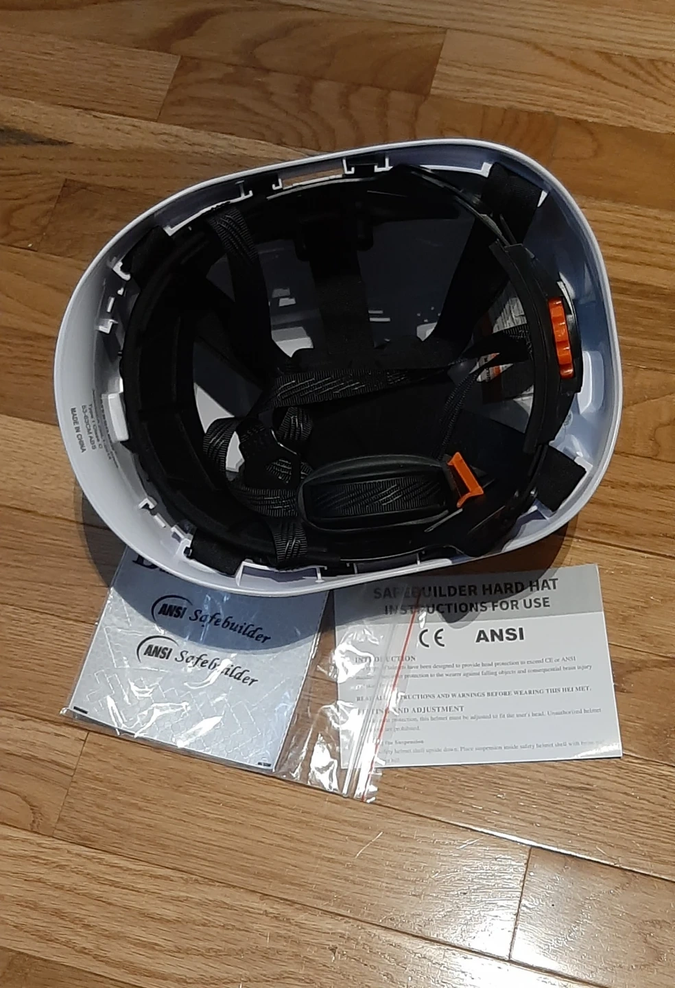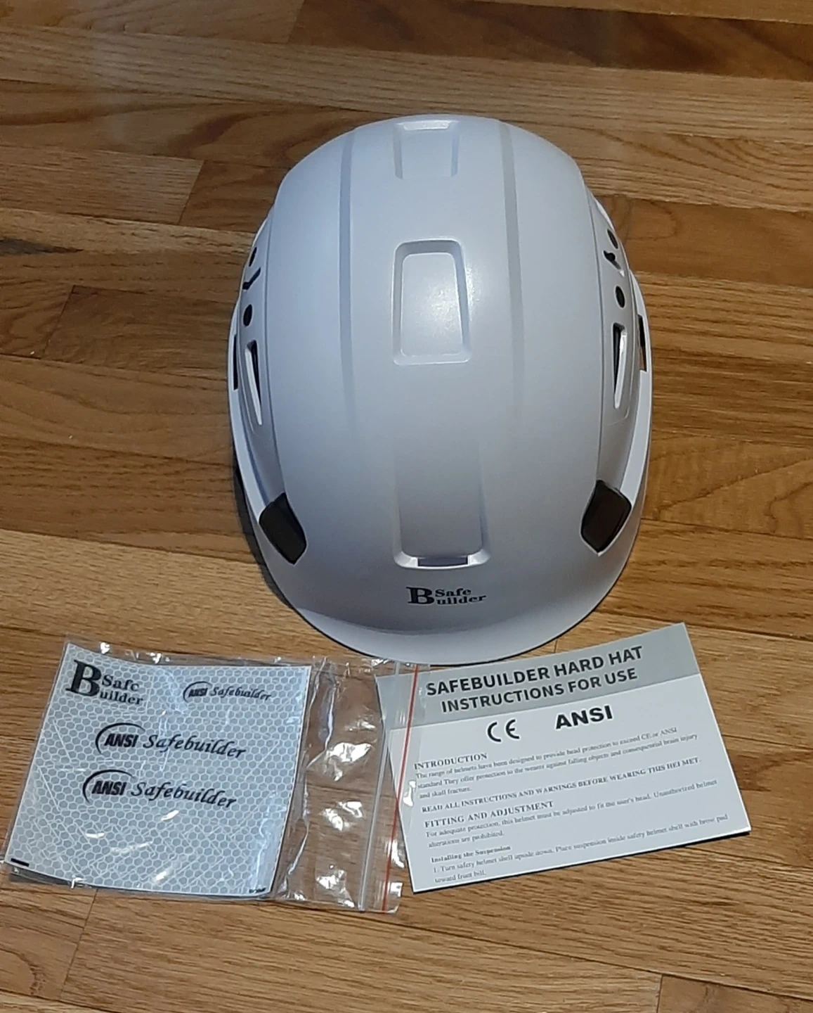 This is a SafeBuilder Type I Class C hard hat. It's made of ABS material and fits a 53-63 cm head circumference. Includes instructions and reflective stickers,,