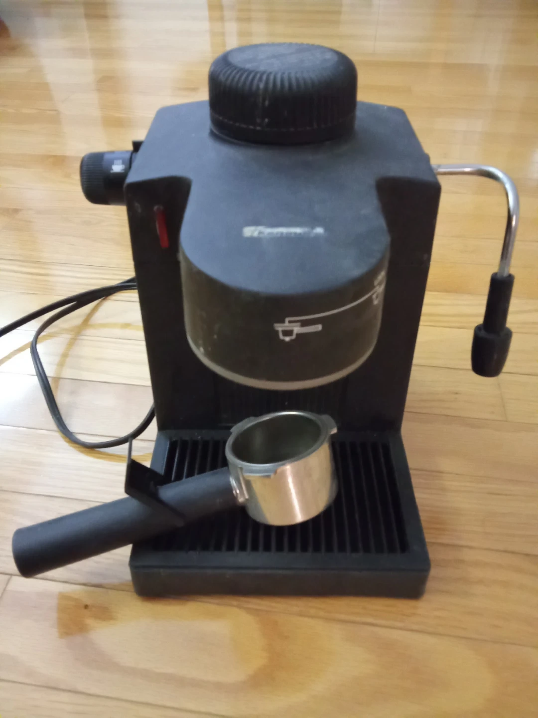 This is a Kenmore espresso machine for making your favourite coffee drinks at home. It includes a portafilter for brewing. It has a steam wand for frothing milk.