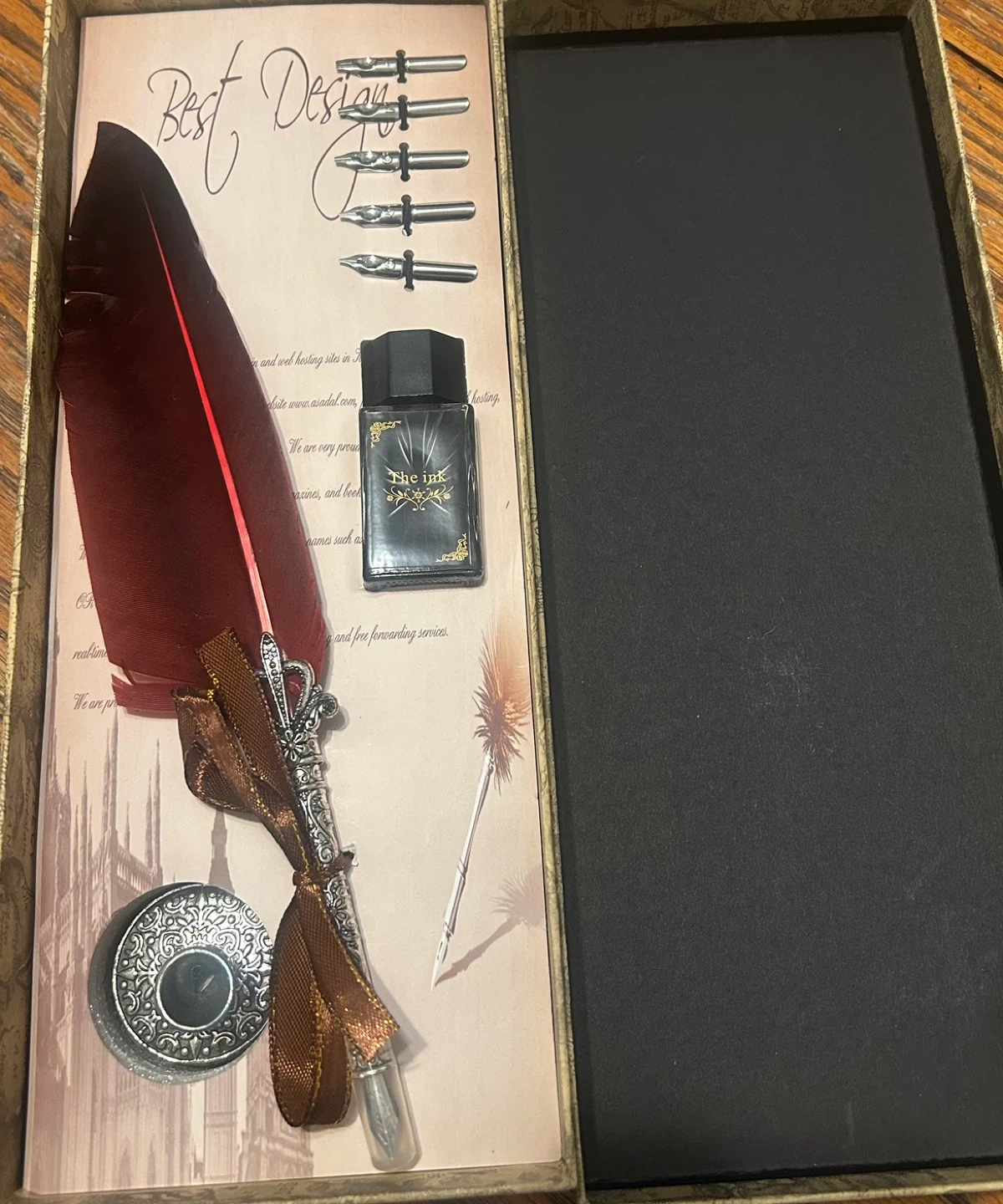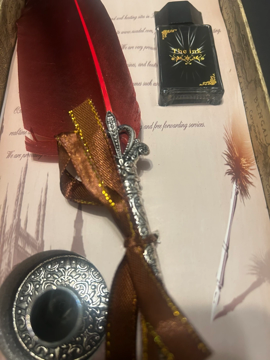 This is a decorative feather quill pen set. It includes a burgundy feather quill, a silver ornate pen holder, a small bottle of black ink ( empty) and multiple metal nibs. It's great for calligraphy or as a unique desk accessory!