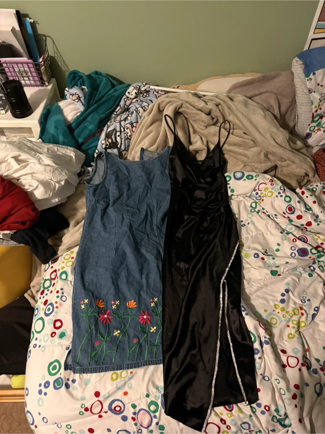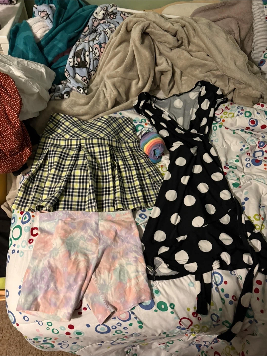 Bundle of 6 women's clothing including a black polka dot dress, a yellow plaid skirt, and tie-dye shorts. Also includes a denim dress with floral embroidery and a black satin slip dress. These pieces offer a mix of casual and dressy options for your wardrobe.