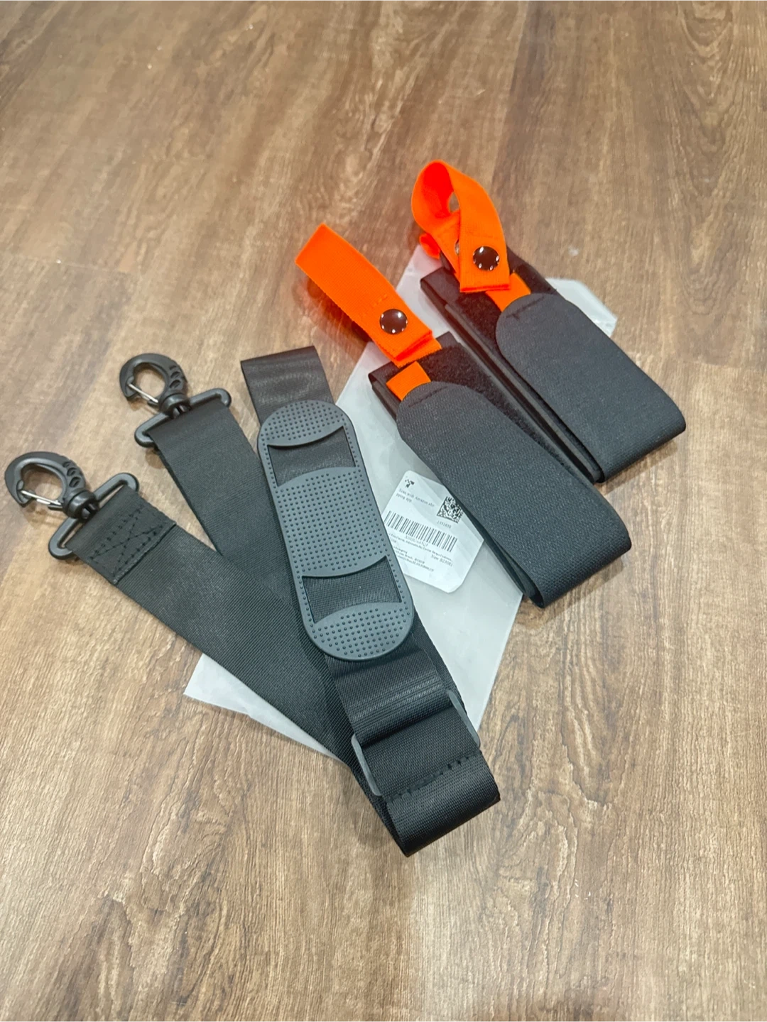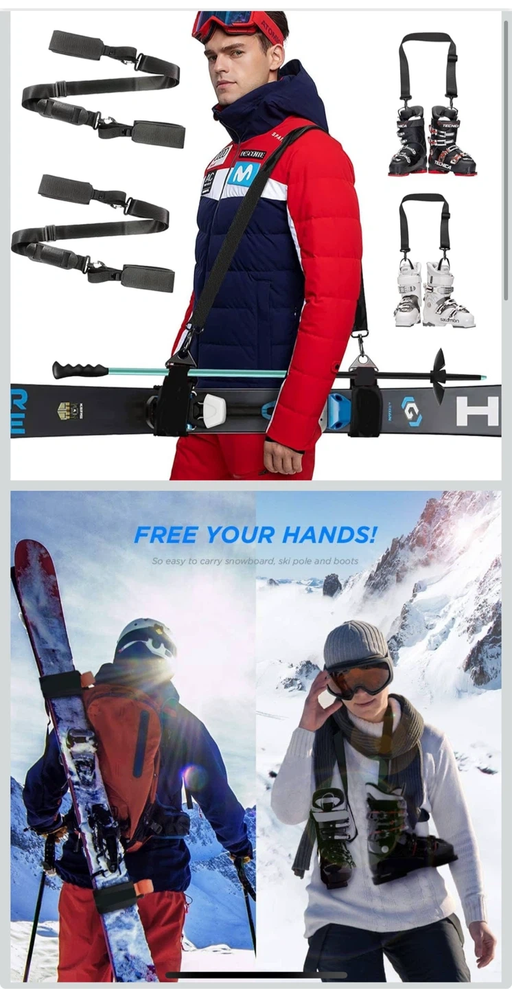 This set includes straps for carrying skis, poles, and ski boots. It features adjustable straps, a padded shoulder strap for comfort, and durable nylon webbing. The hook-and-loop fasteners ensure a secure grip on your gear, freeing up your hands for easier transport to the slopes! It's designed for convenience when travelling with winter sports equipment.