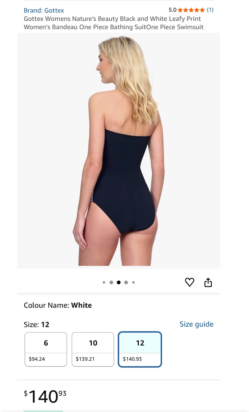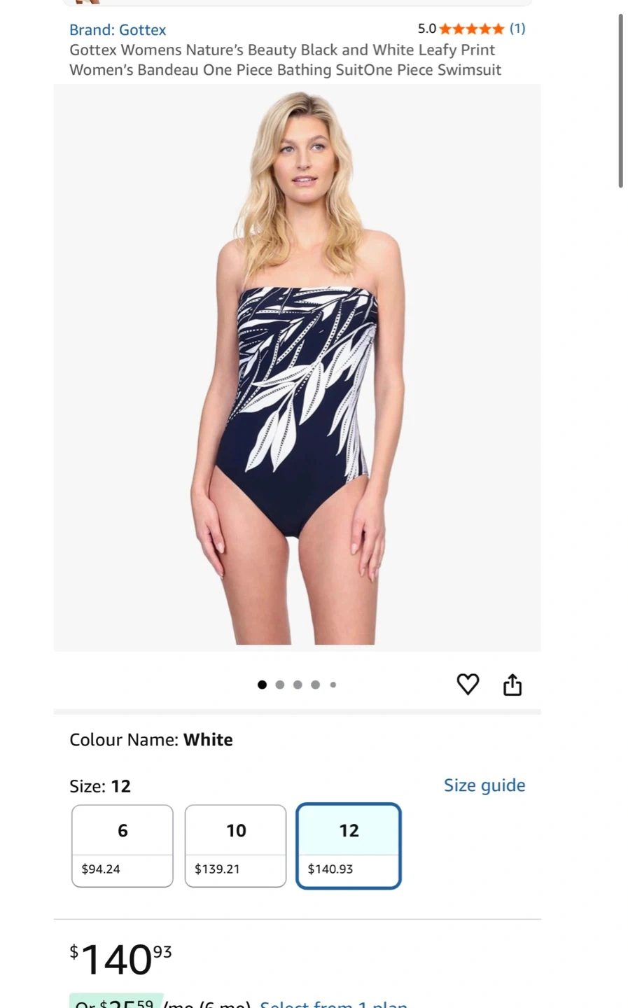 Gottex one-piece swimsuit in a black and white leafy print. It's size 12 and features "more coverage". Perfect for a stylish beach day!
