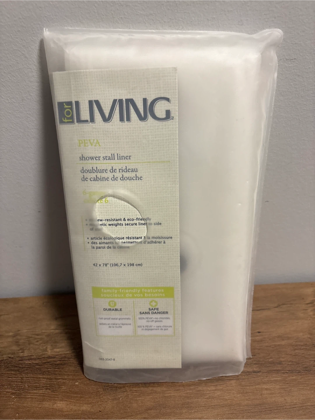 Selling a brand new for LIVING PEVA shower stall liner! It's still in its original packaging. The size is 42 x 78 inches (106.7 x 198 cm). It's mildew-resistant and eco-friendly, with magnetic weights to secure the liner to the side of the tub. It's also durable with rust-proof metal grommets and is safe, made of 100% PEVA, with no chlorides and no off-gasses