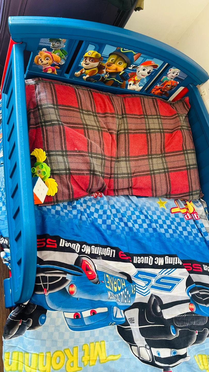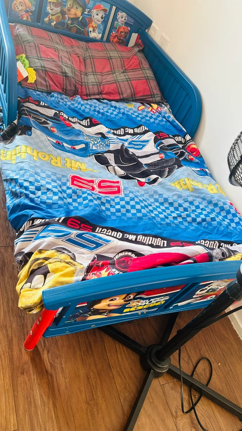 Toddler bed with Paw Patrol and Cars themed bedding. The bed frame is blue and features Paw Patrol characters.