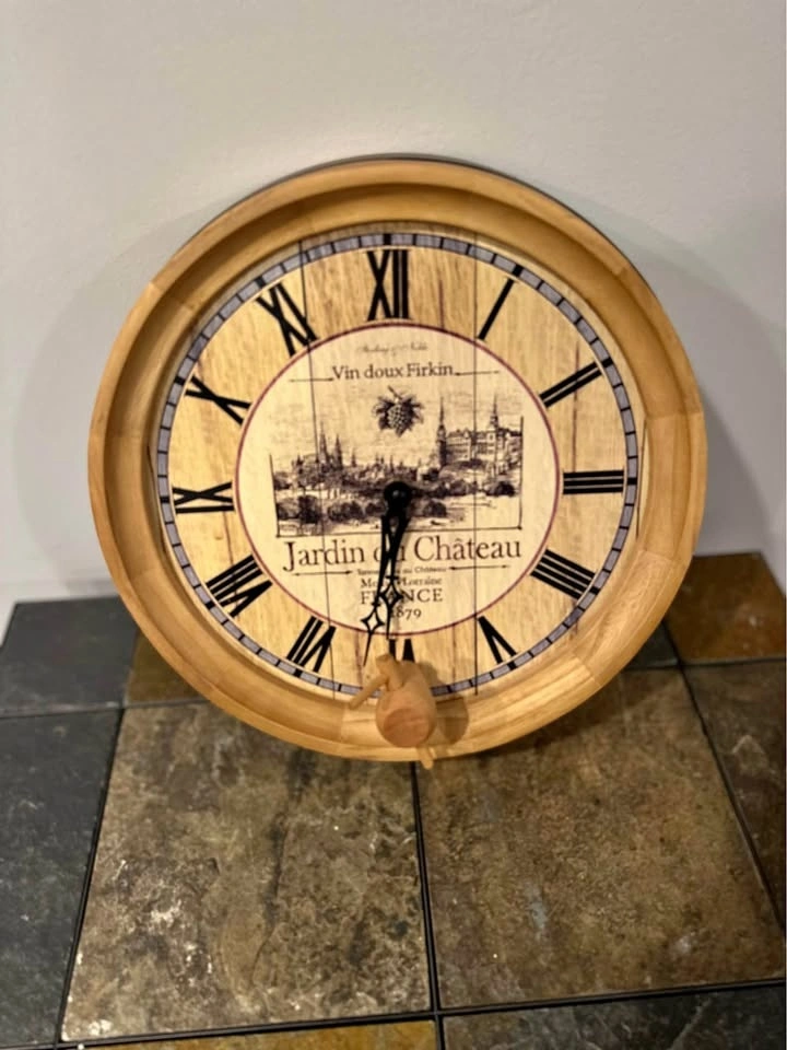 This unique clock adds a rustic and charming touch to any home. It's a great conversation piece and a functional timepiece. Let me know if you're interested!