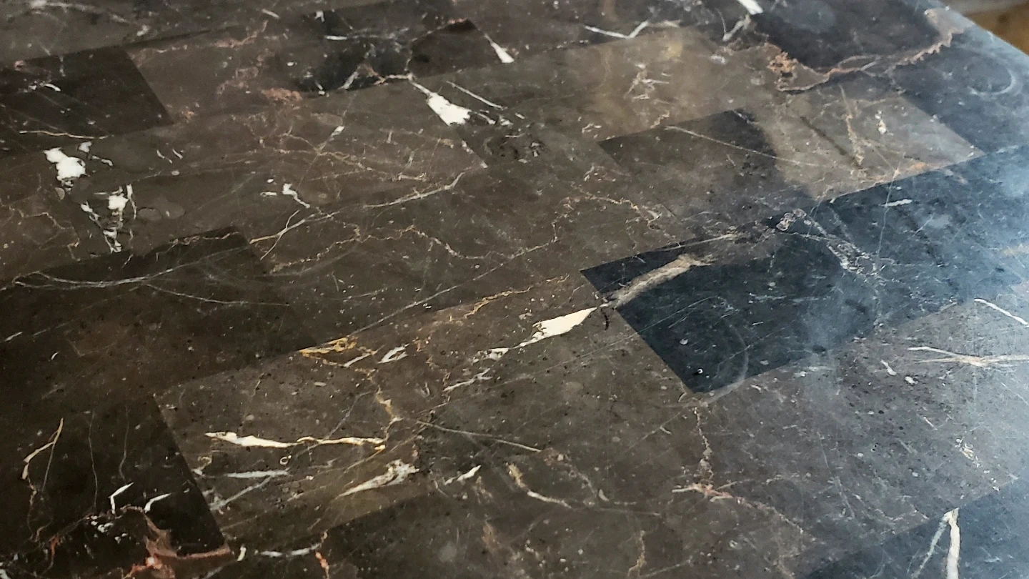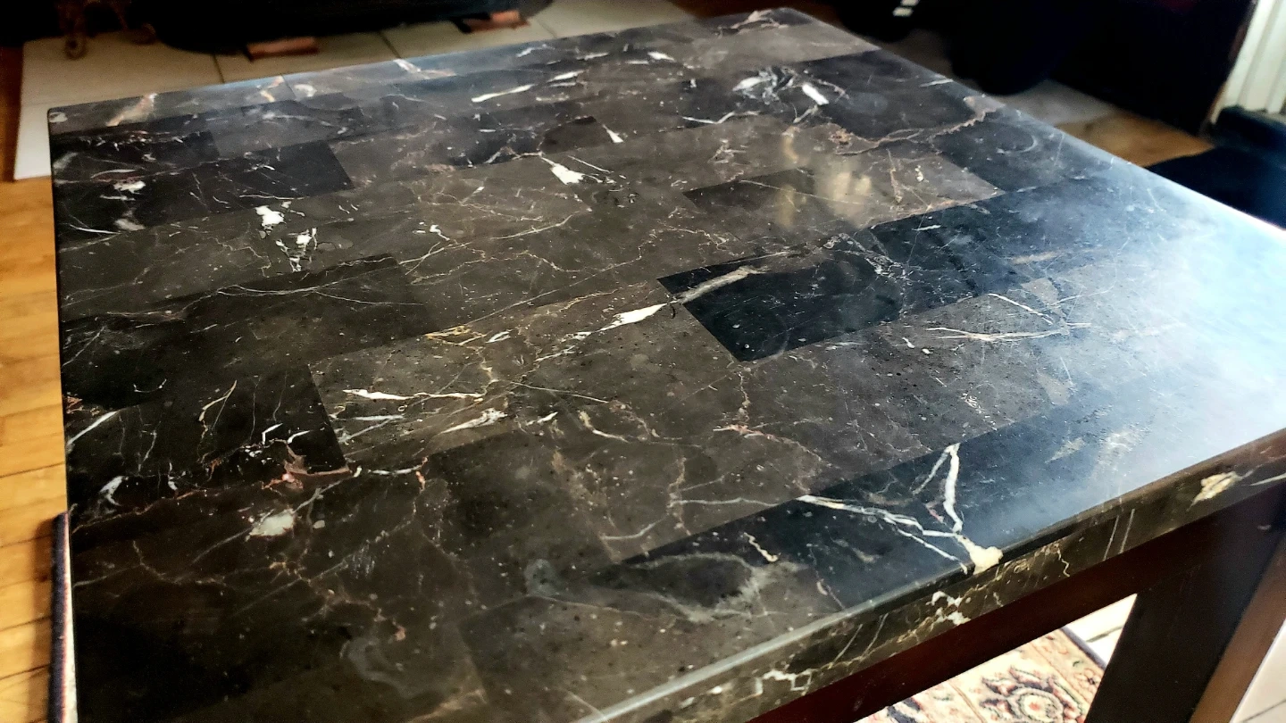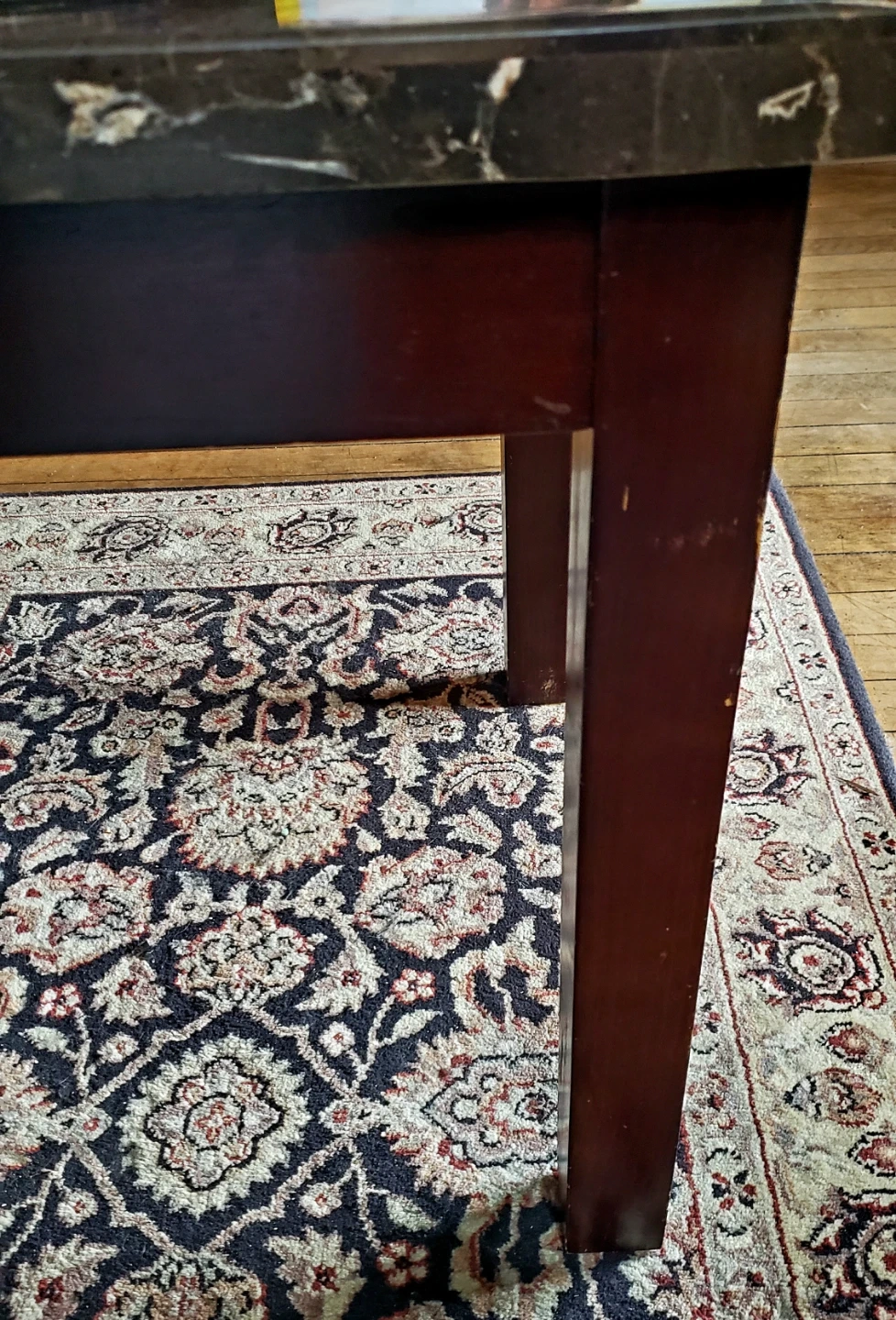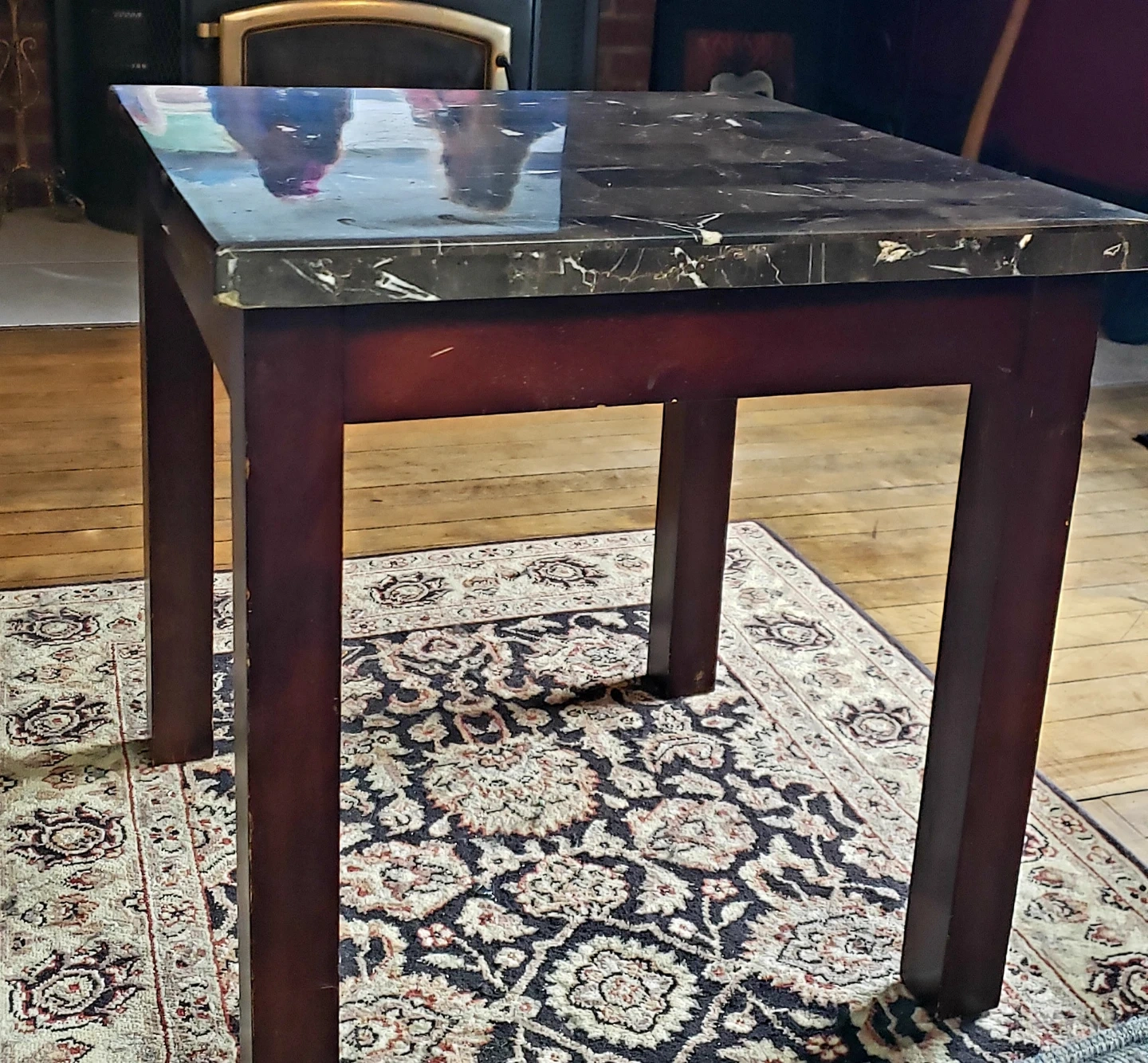 A square side table with a dark marble-patterned top and wooden legs in photo, second table not shown in picture. Second table has scratches on the one leg from cats, it's not in as good of condition as the one shown in the photos although can be fixed!