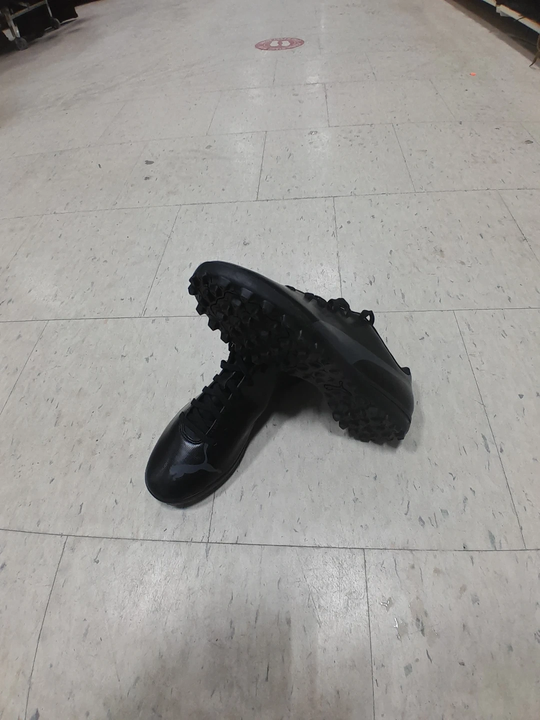 Black Puma soccer cleats. They have a synthetic upper and a durable rubber outsole for traction. Cleats are suitable for turf surfaces men's size 8