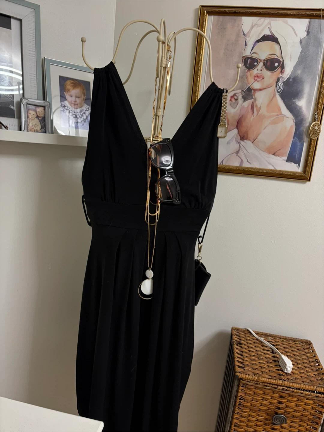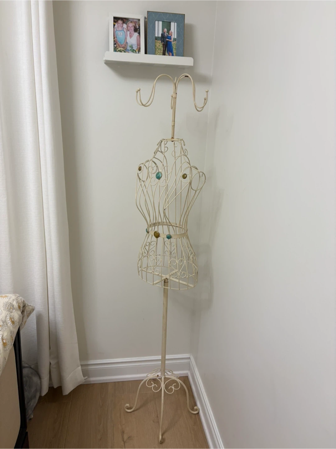 This decorative stand features a wire mannequin torso with beaded accents and a tiered hook top. It's perfect for displaying necklaces, bracelets, or earrings. The cream-coloured finish complements various decor styles. Dress and accessories not included wanted to show how u could also display in your room very unique very sturdy and strong vintage